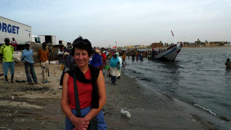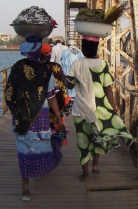 It was a crazy, bustling, fantastic scene: at least 100 boats and what looked like thousands of people — most of them purposeful, dealing with the catch of the day or selling items ranging from beignets to SIM cards to those who did. Some folks waited to spring into action, like the ladies in their amazing Senegalese gowns and headgear. Some of them would later carry buckets of the fish to markets or restaurants around town; others would dry or smoke fish on the riverfront. We threaded our way among them, and while a child here or there commented on our status (“Toubabs!”), for the most no one seemed to even notice our presence. I felt a bit like a time traveler wearing an invisibility cloak.