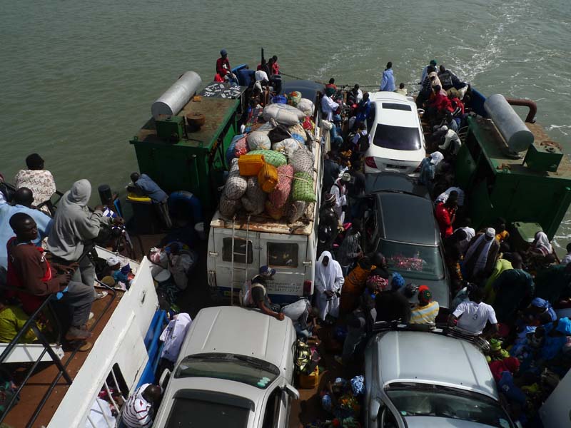 Afternoon crossings on the Gambia river ferry are more crowded and more colorful than early morning trips.