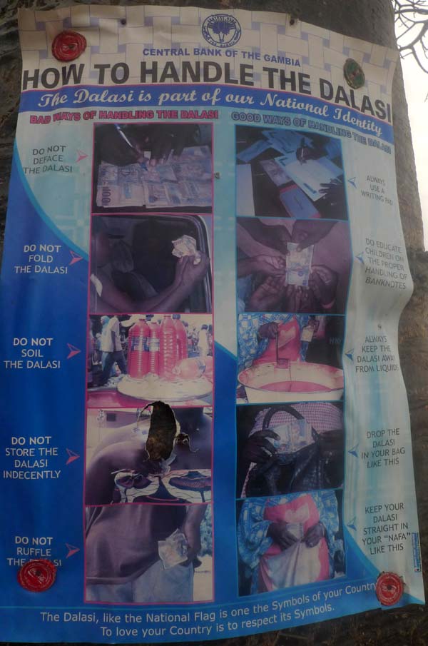 Government poster in the Gambia urges citizens to handle currency carefully to prolong its life: Do not deface, fold, soil, ruffle or store the Dalasi indecently (i.e. in your cleavage, of which many Gambian ladies have ample supply).