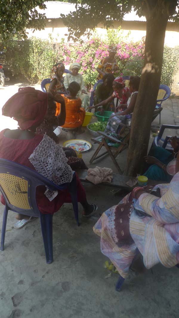 Kolda Ladies Group prepares vegetables for dinner in the shade of a tree in the family compound.