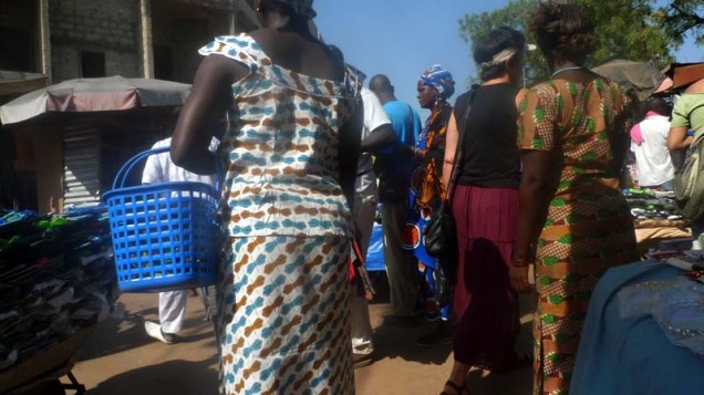 Having Laura as our insider guide made all the difference. The Hobbe’s just a few blocks off the main drag, and yesterday morning, she met us there and led us on foot to the commercial action. Unlike the Kaolack market (much of which is covered and dark), Kolda’s vendors line both sides of block after block of the paved central street. Hawkers of flip-flops, sunglasses, oranges and bananas and lettuce, hair straightening concoctions, bike parts, colanders, cola nuts, peanuts, baobab and palm oil seeds, SIM cards, and more make up a jolly jumble, Laura helped me buy several pieces of the gorgeous Senegalese fabric and then led me to a tailor who promised to transform them into aprons by the end of the afternoon.