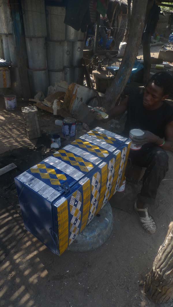 Not far beyond them, blacksmiths hammered metal creations using skills that average Americans haven’t used for 150 years. I was mesmerized by the enclave where sweating men were pounding discarded 50-gallon drums into flat pieces of steel, then shaping those into storage chests. Initially ugly, these were painted bright colors. We watched one stolid fellow dip a wood block covered with raised bumps into a can of white paint, then press that in patterns over a chest that had been painted bright blue. Later, he added yellow sections to the pattern. When he was finished, the chest looked as pretty as something you’d find at IKEA.