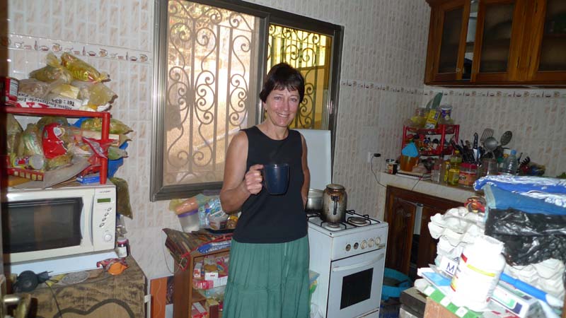 This morning, we awoke early, which was fortunate as Jon knocked on our door at 7:30 to retrieve the iron, which he needed to press his shirt for school. His mother wouldn’t wake till 9, he informed us, so we dug out a pan on our own in her tiny, cluttered, grimy kitchen and made two cups of our instant Starbucks.