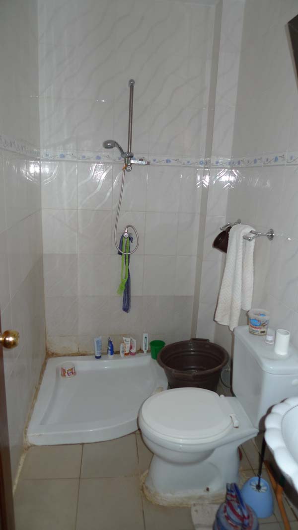 Sineta, her son, and guests in two of her three double rooms share this cold-water bathroom.