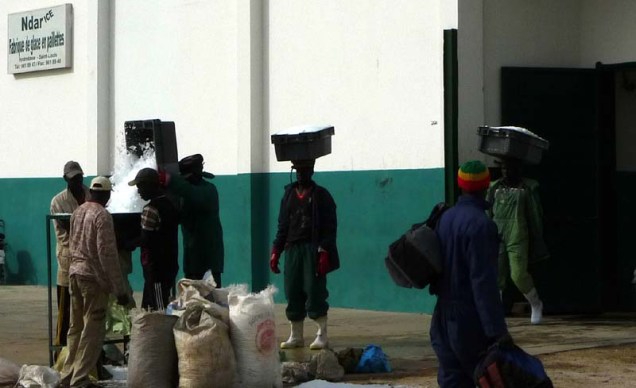 Yesterday morning, we saw the trucks in action. About 10:30, we came to the first of the wooden fishing boats pulled up close to the river’s edge. Every boat, new or old, is painted with bright colors and complex designs (a cheery counterpoint to the tough dangerous life these men who fish with nets must lead.) Strong young men were wading out to the boats and filling large bins with fish, then carrying the bins (again on their heads) to trucks parked nearby. They would dump one bin of fish into two empty bins, which were then filled with ice, later to be trucked to inland places like Kolda (so people like Laura’s host mother could serve us delicious fresh fish with our rice.)