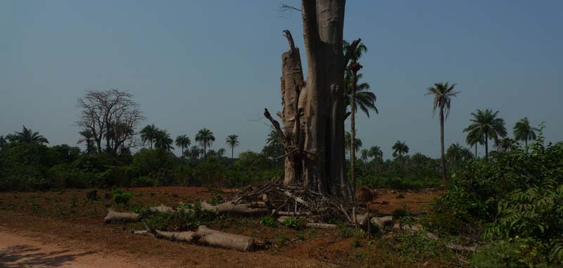 Road to Praia de Bruce on Bubaque: Most islanders live in mud-brick houses with thatched or sheet metal roofs.Centuries old trees are being cleared for cashew orchards. Praia de Bruce on Bubaque remains pristine, but for how long?