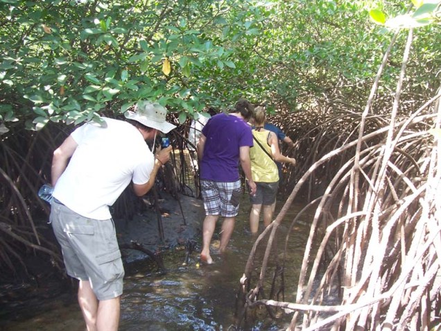 Other animals that live here include warthogs, bats, red and green monkeys, antelope, and those pesky hyenas. But I think the greatest stars are the mangroves — those magnificent plants that have adapted to live in salt water, creating new land as the silt builds up around their roots. Yesterday morning, a guide led a small group of us on an hour-long trek through some of their inner recesses. Barefoot, we followed serpentine streams through the shady green vegetational tunnels. The plants have evolved to filter out the salt; they excrete it on their leaves, which are crusty with the stuff. In places, we sunk up to our ankles in the ooze, taking care not to scratch our arms and legs on the knobby thickets of roots. Because our guide, Famara, had declared that the groves harbored no poisonous snakes (and because I tried not to look too closely for spides and insects), it was a magical world — one I never dreamed I would penetrate.