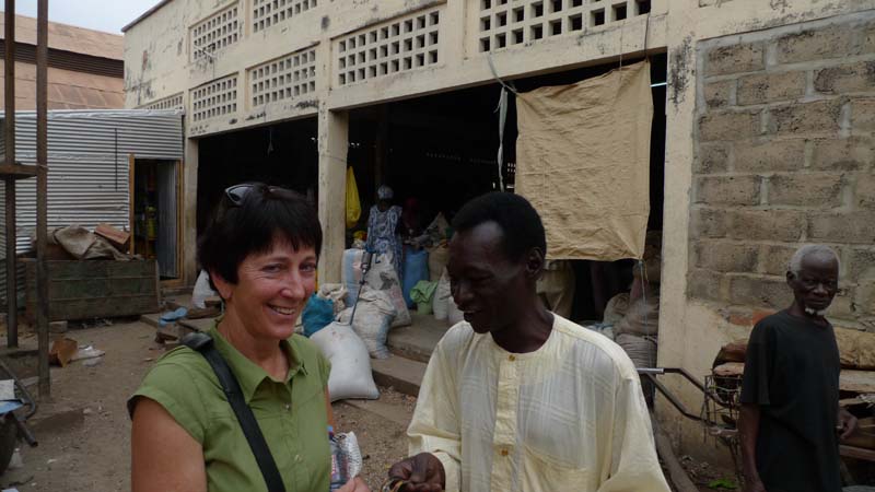 We did make two purchases — several oranges, tangerines, and bananas (for just under $3), and 3 small but charming necklaces. Asked a ridiculous 10,000 for the latter we refused, but when I got the price down to 3500, I accepted. High drama erupted, however, when I started to pay: violent shouting between Moussa and the seller, culminating in Moussa snatching the money and signaling us to stomp off behind him. A bit further on, he found identical necklaces being sold by some ladies — for which I paid 1500. (Apparently the injustice of the first price was too intolerable for him to bear.)
