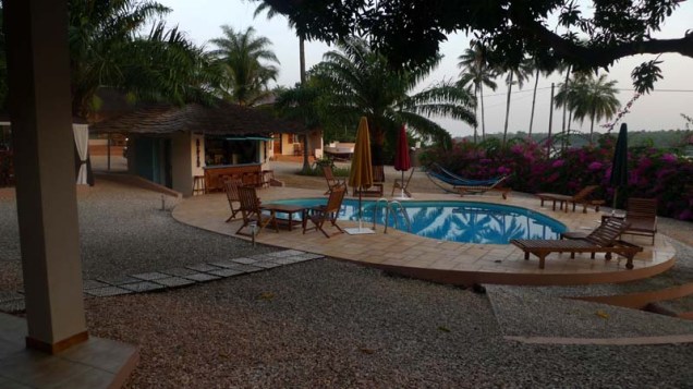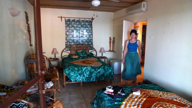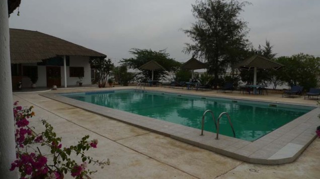You might not travel to Kaolack to stay at Le Relais. But apart from the unpleasant smell that permeated the town upon our arrival, the hotel seemed to us an excellent way station. Well-tended gardens filled much of the grounds, and the pool was large and welcoming, if a bit murky. Our room, which cost about $65 a night boasted air conditioning, a TV, and hot water, and a shower that worked well. Although the power went out almost immediately after our arrival, the sound of a generator kicked in around dusk, and we ate excellent fish and surfed the internet on our laptops in the huge, well-lighted dining room.