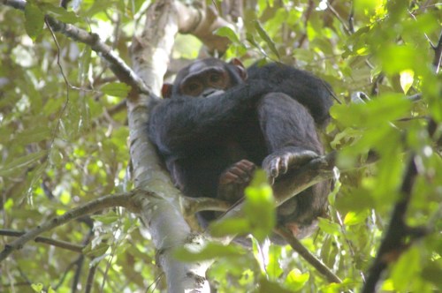 When the chimps moved, we moved, bushwacking through the undergrowth and pausing periodically to observe one thing or another overhead. We watched the apes feeding on berries, then saw a female breaking off branches, high above, to swiftly make her day nest. Bosco explained that each chimp makes a night nest too, typically making a new set of both every day (or else relining an pre-existing one.) A few minutes later, he made a comment about a chimp’s erection. “You can see his erection?” I exclaimed, incredulous. (I couldn’t see the whole damned animal, let alone his diminutive sexual member.)