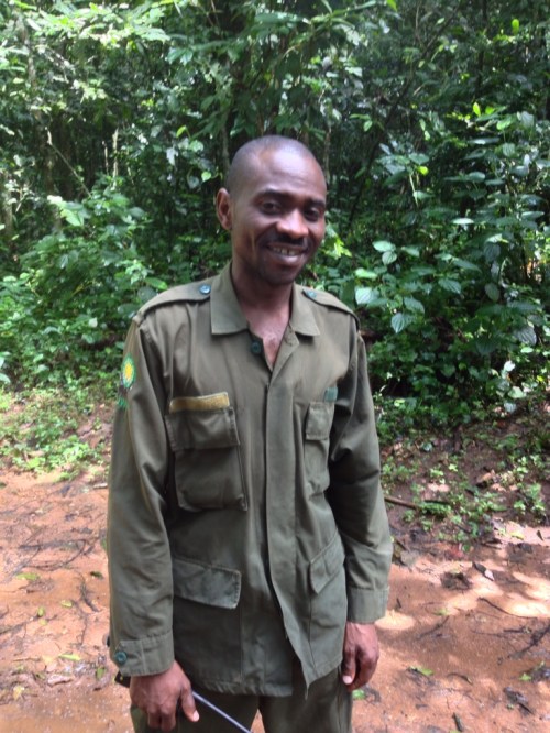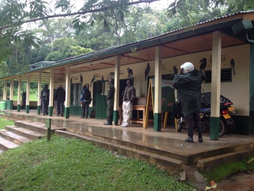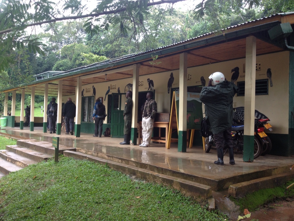 We arrived at the park headquarters around 8. I was already in an exultant mood, thrilled to be in my first true African rainforest. It wasn’t at all steamy and jungly. It had rained in the night, and a cool mist continued to drizzle down. Along with a dozen or so other tourists, we assembled for a briefing by Bosco. Among other safety tips, he warned us not to make noises imitating the chimps. We might inadvertently make the wrong call, with negative consequences