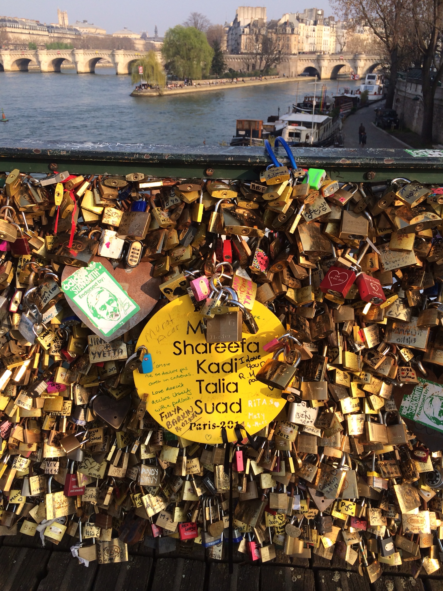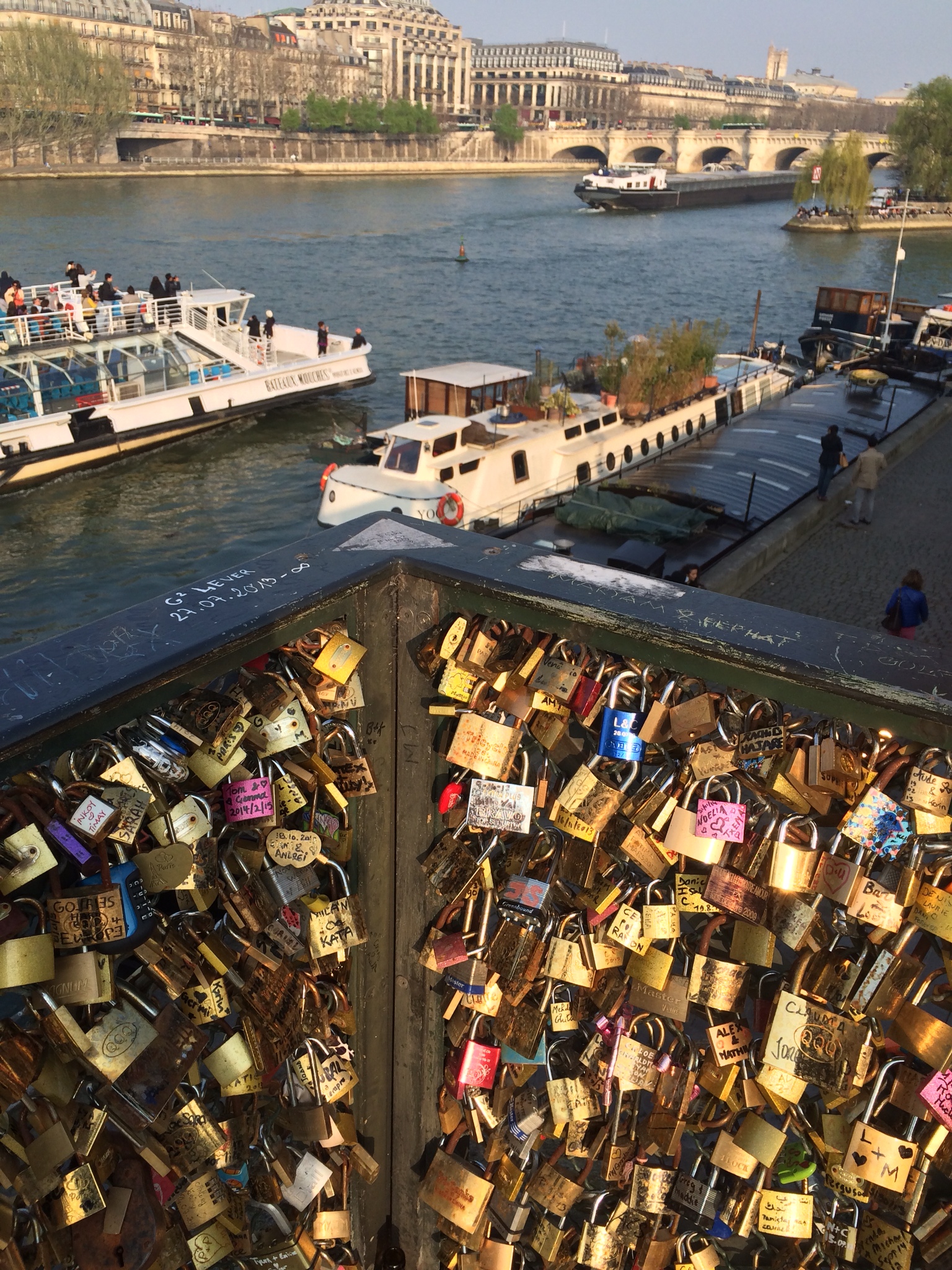 We searched for a spot that could accommodate our lock (which I had bought at the dollar store in Pacific Beach and on which I had painted our initials in pink nail polish.) We found a free patch in a corner facing the Ile de la Cite. We clicked it into place then asked a passing young woman to photograph us next to it. She looked like she was hurrying somewhere, but then she took shots from seven different angles — making sure to capture one we would like. We thanked her, moved to the center of the bridge, then hurled the key into the river. I heard a guy in his 20s exclaim in pleasure at the sight of us.