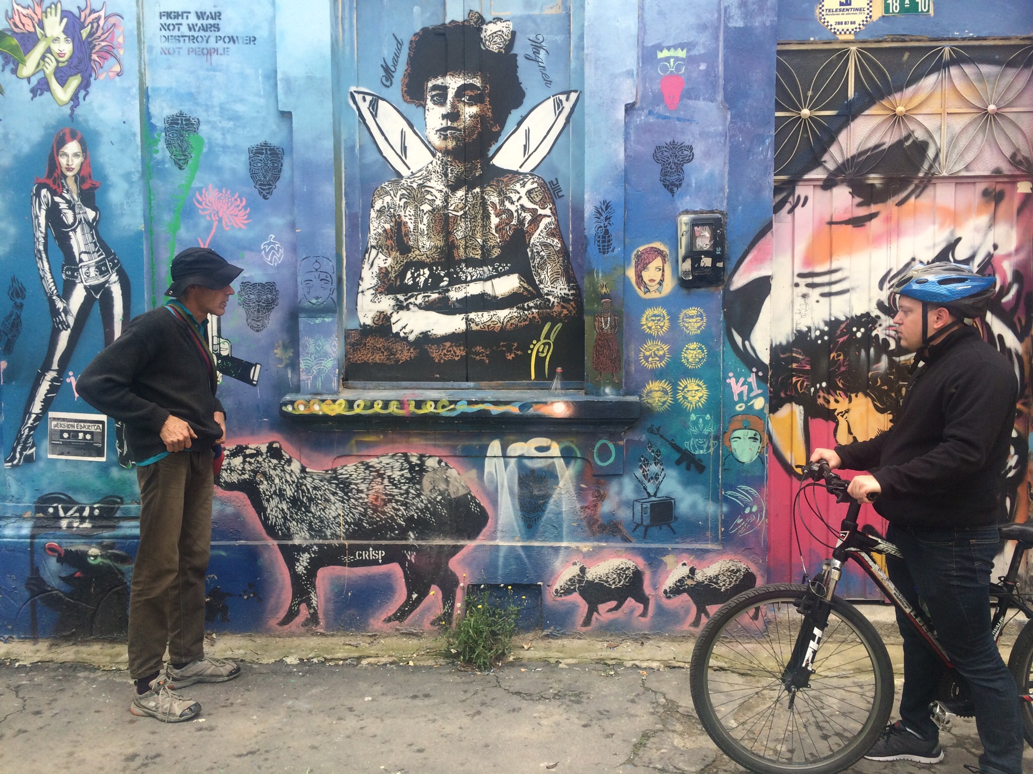 Mid-afternoon, we took a break at a coffee-roasting shop that served up excellent cappuccinos and pastries. Then we pedaled through the Santa Fe neighborhood, one of the areas of Bogota designated as an official “Tolerance Zone” for “high-impact public activities” (translation: this was one of Bogota’s legal prostitution areas, one or perhaps the only one in which the sex workers can flaunt their offerings on the street, rather than just in discreet bordellos.) Mike warned us not to take any photos; he said it made the hookers angry.