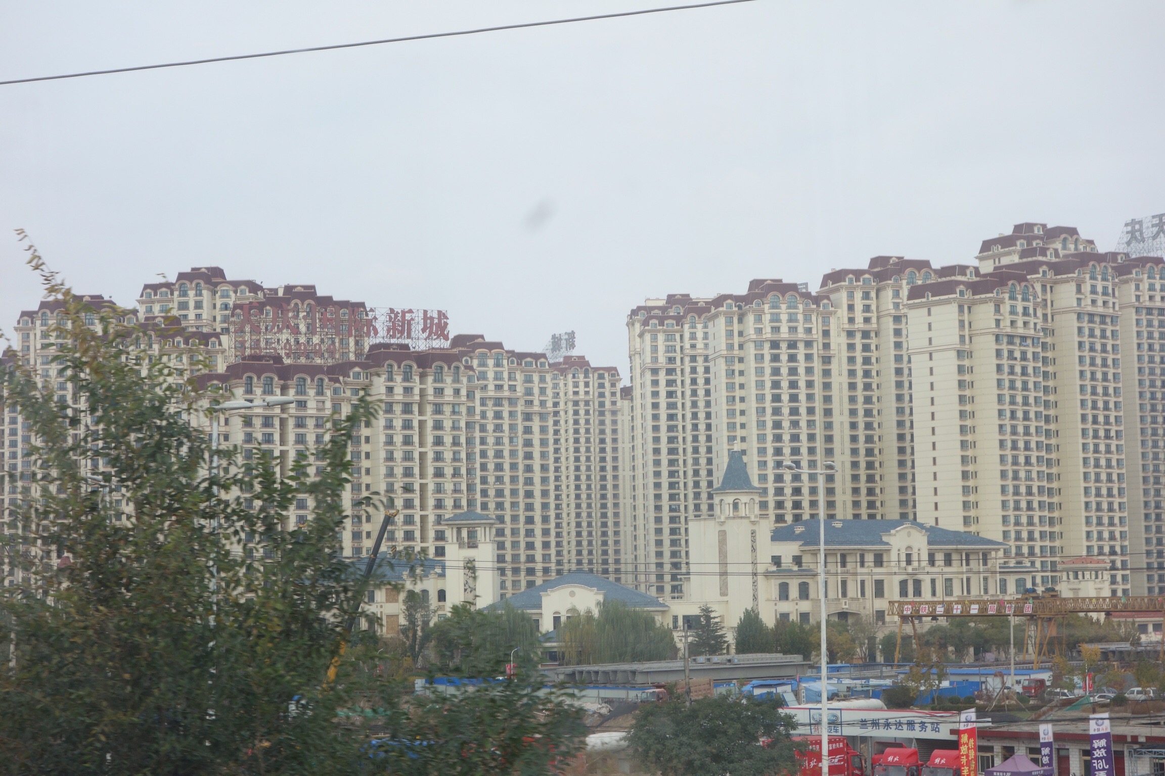 5 pm — We’ve spent the last several hours staring at the muscular mountains of Gansu province. They frame huge valleys, every inch of which is farmed or occupied. Mysterious caves dot many hillsides. Every few minutes, we also see clusters of mind-bogglingly huge apartment buildings. They’re interspersed with more farms and at one point, a sea of greenhouses.