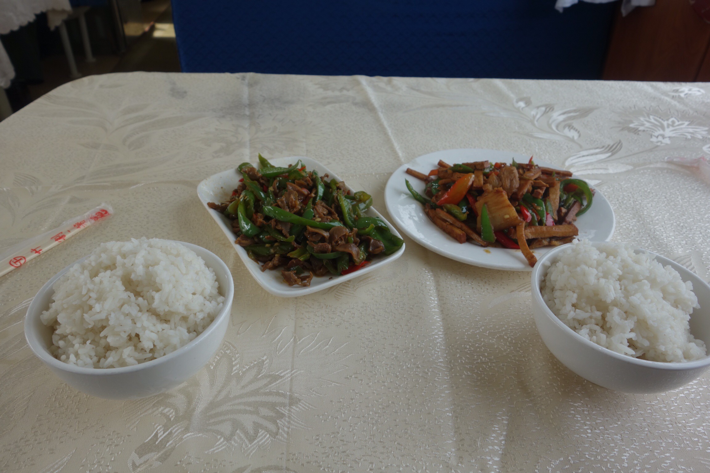 “Is there chicken?” I counter. “For two. And beer?” This prompts him to scribble something on a piece of paper and to demand from us 50 yuan (about $7.40). That seems awfully cheap, and we soon find out why. We get only one dish consisting of small pieces of bony chicken and hot peppers, two bowls of rice, and two watery bowls of soup. No beers.