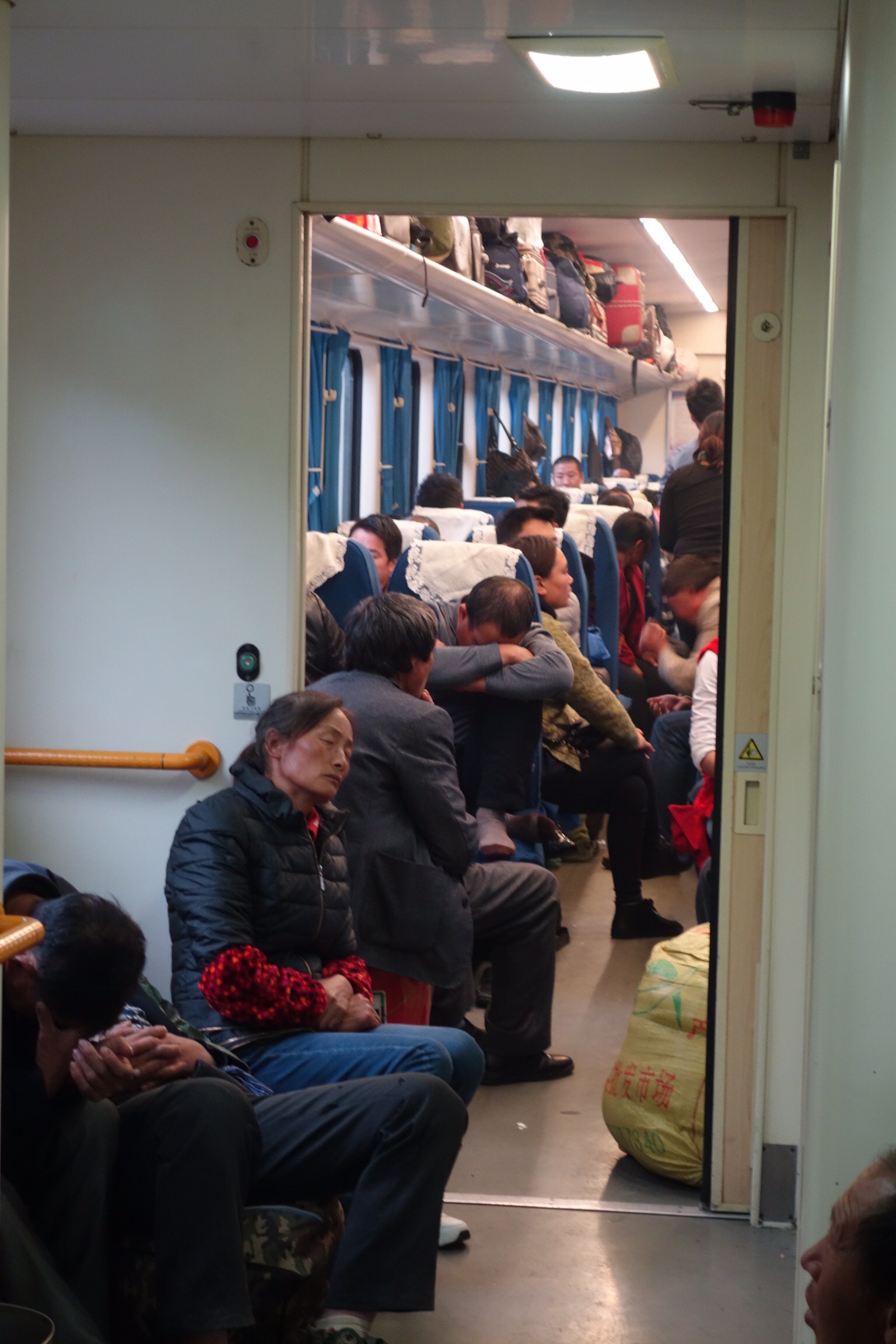 The train has three fare classes. “Soft sleeper” tickets don’t cost much more than the next grade down, but the train has only a few such cars, and competition for the berths is fierce. Despite the beguiling name, the 4-person compartments offer little privacy. Picture two sets of narrow bunk beds packed into a very small room. The “hard sleepers” contain two additional bunks (6 beds total), so things are even more cramped. Your only choice is to be lying down (on your bed) or hanging out in the corridor. The third category are like any train seats. You sleep sitting up in them.