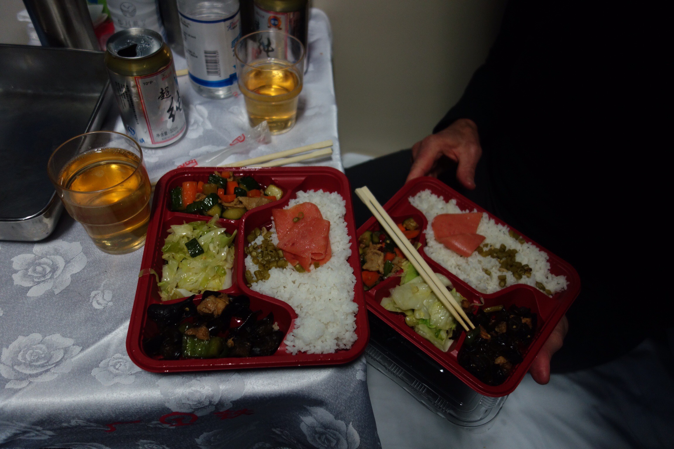 The dining car staff kowtows to them, serving up a variety of dishes immediately and several times offering extra rice. All this helps to distract me from how hungry I am. (Those breakfast pickles lack staying power.) We’ve grabbed a couple of stools and are determined to wait until the first shift of lunch patrons eats and leaves. At one point, a Chinese guys sits down in the remaining stool, and a waitress gruffly shows him the hand-written menu and takes his order. She ignores us. This irritates me.