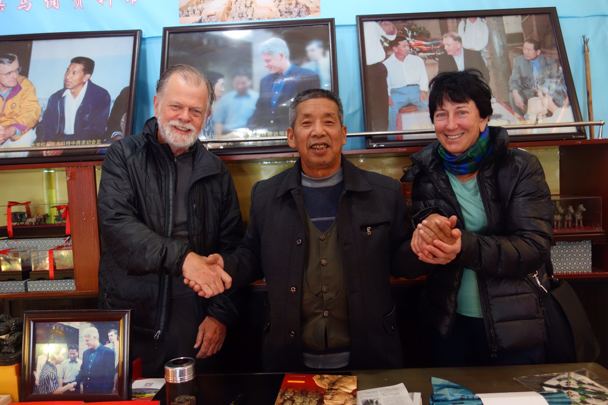 Perhaps our coolest stroke of luck was that we met… Farmer Wang! His digging days are long gone. He’s rich and famous, our guide said, and his family owns one of the fancy gift shops that have been erected on the complex grounds. He’s not there every day, but when we popped in, he was sitting at a table piled high with the book that bears his name. An assistant told us if we bought one of the book/postcard packages for 200 yuan (just under $30), Farmer Wang would autograph it and pose for a photo with us. Who could resist that?