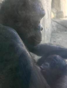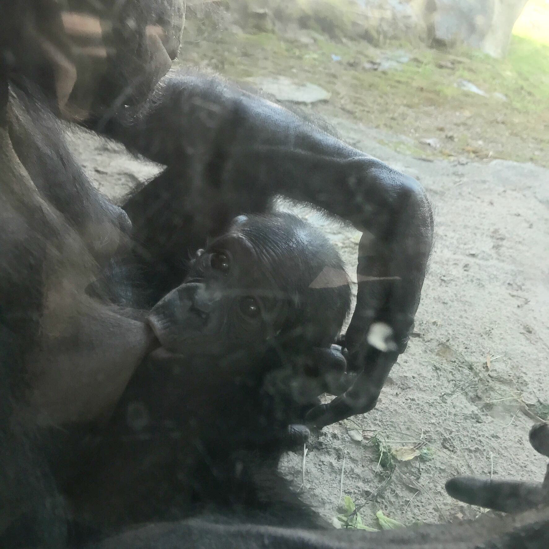 The baby looked very young — less than a year? The mother settled into the corner near the glass, and the baby began nursing. We were inches away, albeit viewing all this through scratched, milky windows that made it hard to take good pictures. The baby sucked at one of its mother’s breasts. It moved to the other side and gazed at its mother adoringly, but also periodically focused its attention on Steve and me. We stared back. I tried to communicate some sense of solidarity with the pair, to project my respect and admiration.