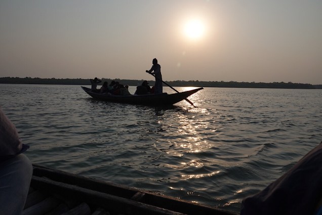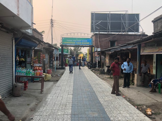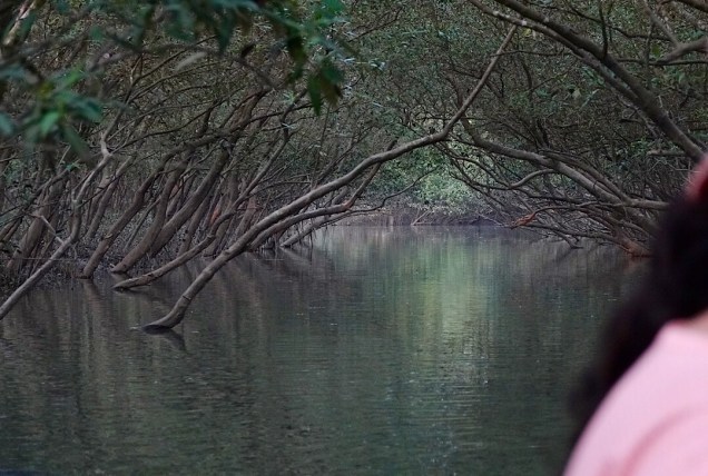 We didn’t go there to suffer. Rather, we wanted to see one of the geographic wonders of the world. The Sundarbans is the enormous estuary where some of India’s biggest rivers — the Ganges, the Brahmaputra, and others — split into dozens of branches and flow into the Bay of Bengal. The area includes both an Indian and a Bangladeshi section. What grows there, mainly, are mangroves, the shrub which somehow learned to suck up seawater and excrete the salt. The Sundarbans mangrove forest is the biggest on earth. More than 80 species grow so densely you can’t see more then a few feet into them, and they shoot up stick-like “air roots” that can impale anything that steps on them. Despite that, a number of creatures survive in this harsh environment, the most famous being the Royal Bengal tiger.