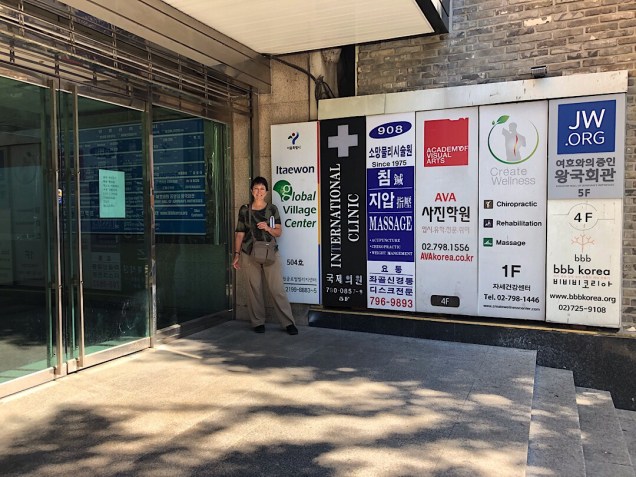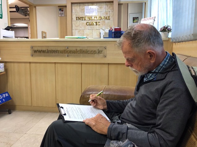 …and have our height, weight, temperature, and blood pressure checked. Then we were ushered in to see the clinic’s owner, Dr. Sooyoung Kim, an urbane guy dressed in jeans and a casual longsleeve shirt who spoke English like an American. We chatted with him about what we wanted (vaccinations against Japanese encephalitis (for me) and cholera (both of us). He approved our plan and sent us off for processing by his efficient nurse.