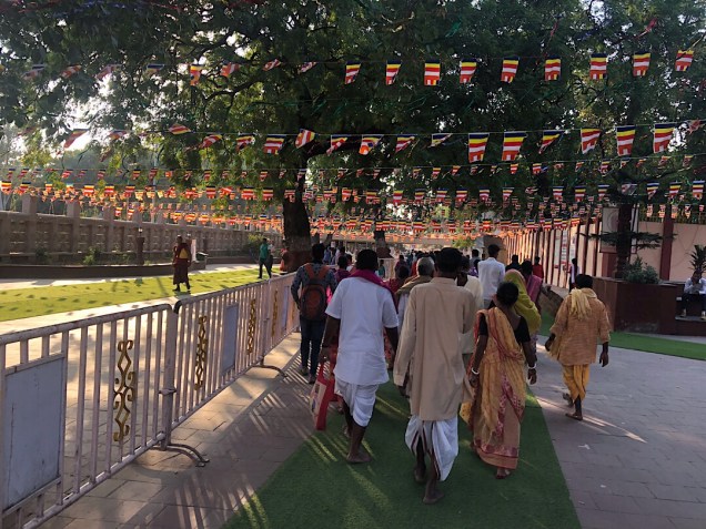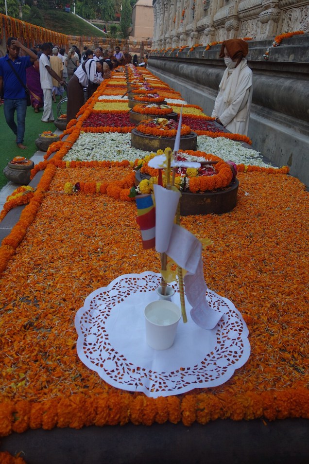The auto rickshaw rides to and from Bodhgaya were jarring, terrifying, indescribably loud; by the time we reached our destination, I felt like blood should be running from my ears from the audible assault. But I’m happy to report the main temple complex, a pedestrian-only zone, is lovely. Steve and I strolled down a broad clean pathway along with hundreds of other pilgrims under rows of fluttering flags.