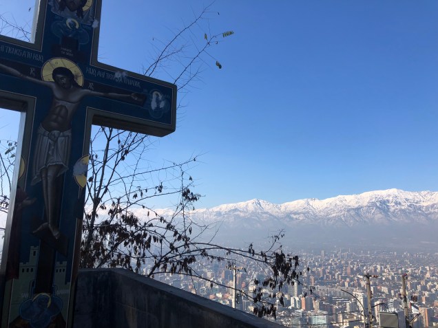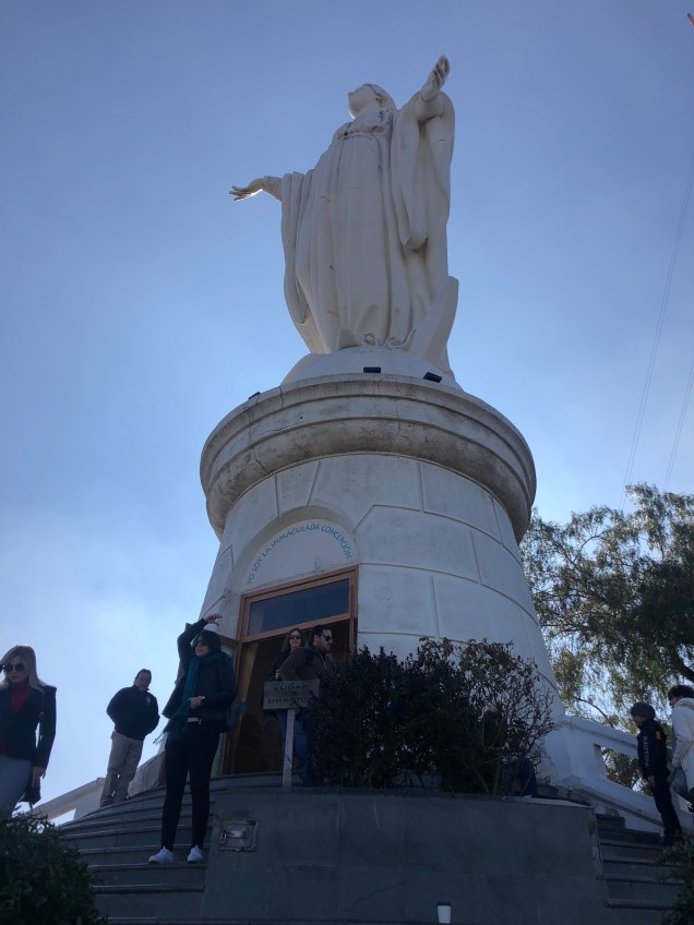 Saturday morning, Santiago felt like a different city. The rain was gone, and patches of sunny blue sky flirted with light clouds. It took us a while to get organized, but by late morning, the five of us had walked to the foot of Cerro San Cristobal, a spur of the Andes that’s one of the city’s most prominent landmarks. An ancient funicular carries passengers up to the top, near the site of a tower Virgin Mary. She looks quite striking