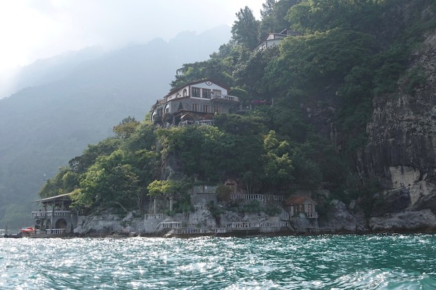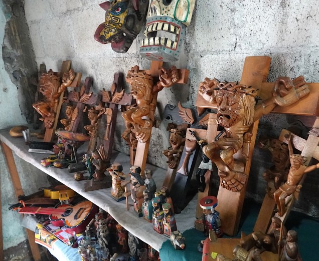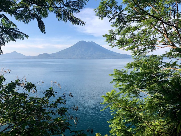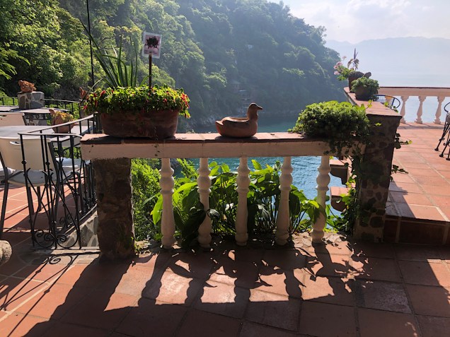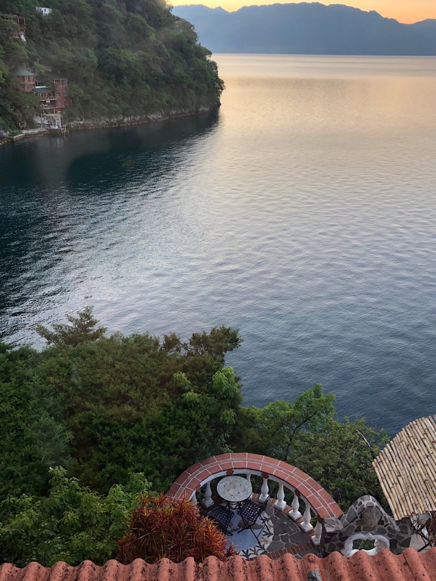 At the foot of the public pier in the town of Panajachel, we caught a launch to our hotel, La Casa del Mundo. Built starting in 1980 by a Guatemalan woman, Rosy Valenzuela, and her American husband (Bill Fogarty), it’s one of the most remarkable places I’ve stayed anywhere. Every cottage built on the vertiginous stone cliff commands heart-stopping views.