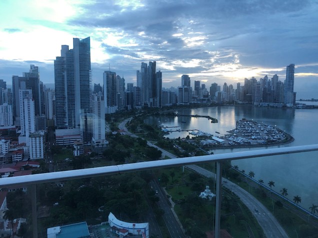 We drove to Panama City, turned in our rental car, and took a taxi to The Sexiest Condo in Panama, which is how Vicki Marie S bills her unit on the 31st story of a high-rise overlooking Panama Bay. I used more of our home-exchange Guest Points to secure three nights for us here, and I have to say it is pretty sexy. Here’s the view of the city skyline from the balcony outside our bedroom with its king-sized bed.