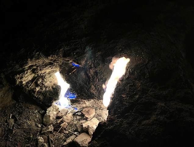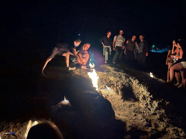 The guidebooks say they can be extinguished by covering them, but they will pop up again nearby. Steve judged it to be a natural gas seep, mostly methane. The Greek myth is a lot more romantic, however. According to it, the lady monster had the head of a lion, the body of a goat, and the tail of a dragon. Mounted on the winged horse Pegasus, the hero Bellerophon killed the Chimaera by pouring molten lead into her mouth.