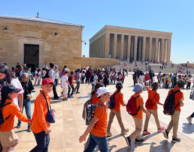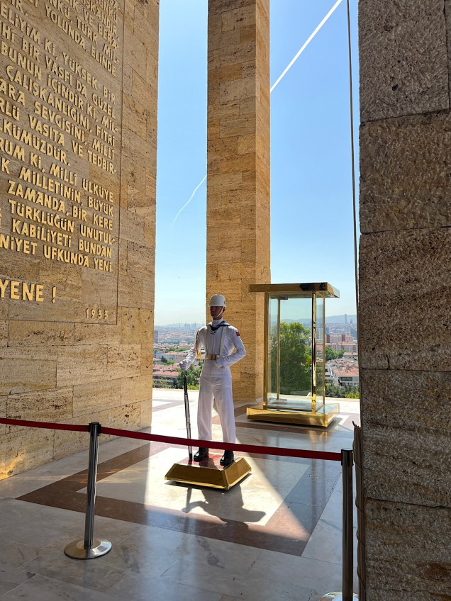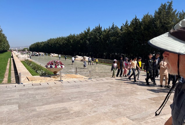 Thursday morning (5/26), we taxied to the first Major Attraction, Ataturk’s Mausoleum. Mustafa Kemal Ataturk, as anyone here will tell you, was the father of modern Turkey. Bold, intelligent, and charismatic, he led the resistance movement against the Ottoman sultanate and later, the Greek invaders, and in 1923 became the first president of the new Turkish republic. He spent the rest of his (relatively short) life working to transform the place from a medieval theocracy into the modern, secular, industrial powerhouse it eventually became. It was he who moved the capital from Istanbul to Ankara. Over the years, I have visited some of the most impressive tombs on the planet — Mao’s on Tienanmen Square, the Taj Mahal, Lenin’s final resting place in Moscow, Ho Chi Minh’s in Hanoi — and the complex containing Ataturk’s body ranks among them.