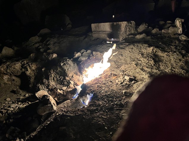 The guidebooks say they can be extinguished by covering them, but they will pop up again nearby. Steve judged it to be a natural gas seep, mostly methane. The Greek myth is a lot more romantic, however. According to it, the lady monster had the head of a lion, the body of a goat, and the tail of a dragon. Mounted on the winged horse Pegasus, the hero Bellerophon killed the Chimaera by pouring molten lead into her mouth.