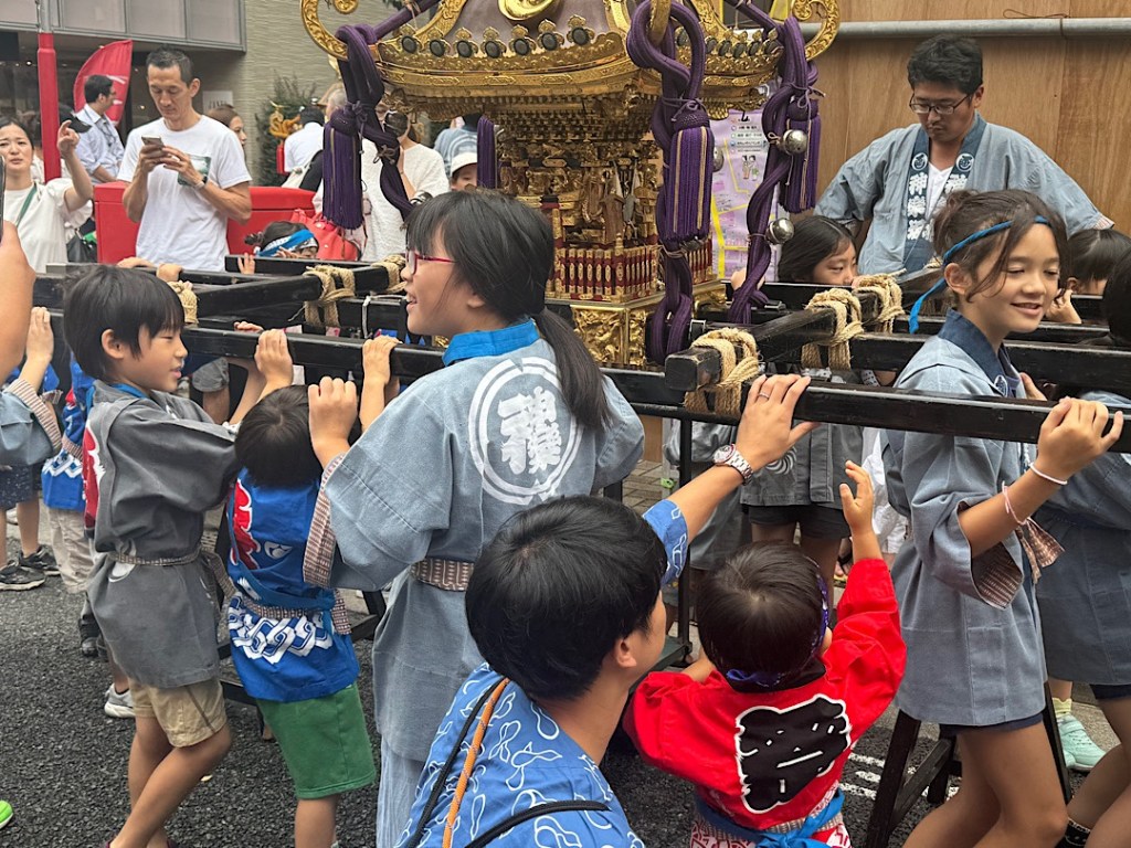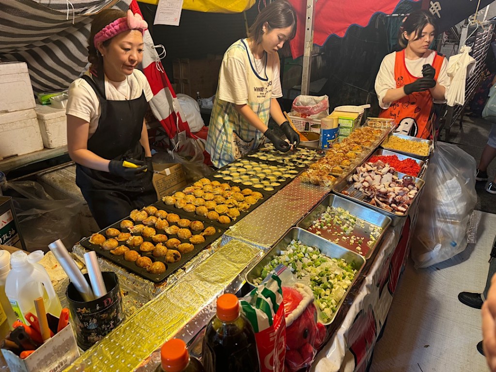 Portable shrines like this one are part of the action.Adults carry them through the street.Even little kids get to take part.But it’s also a chance to drink and eat delicious things like these takomaki — octopus pieces deep fried in delicious batter.Children play street games.The area around the temple was jammed.