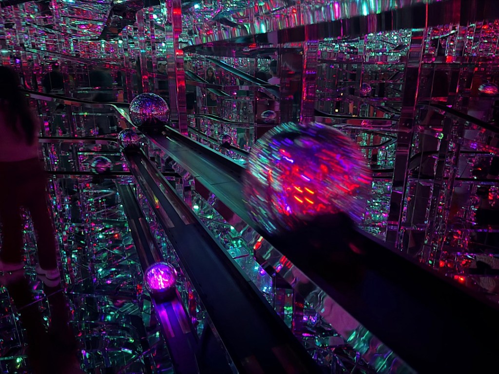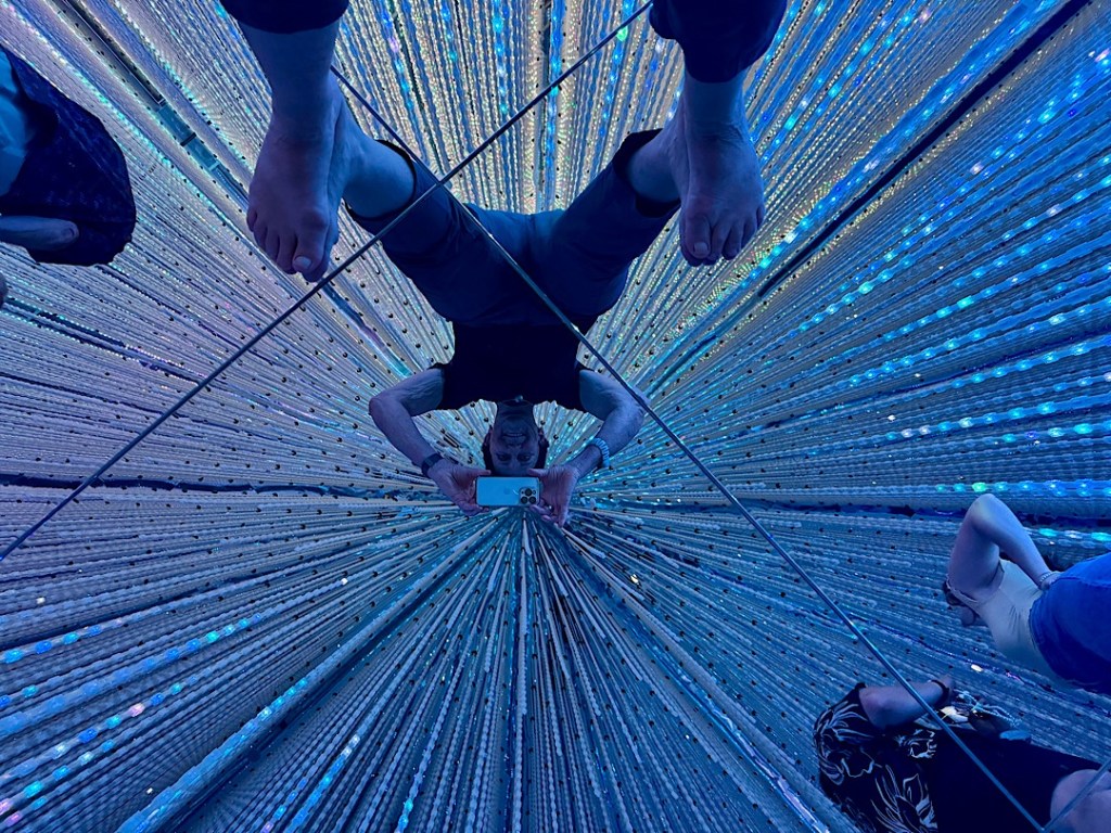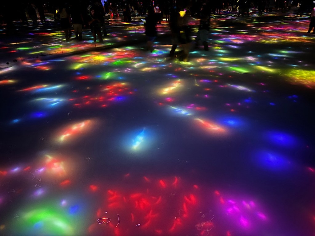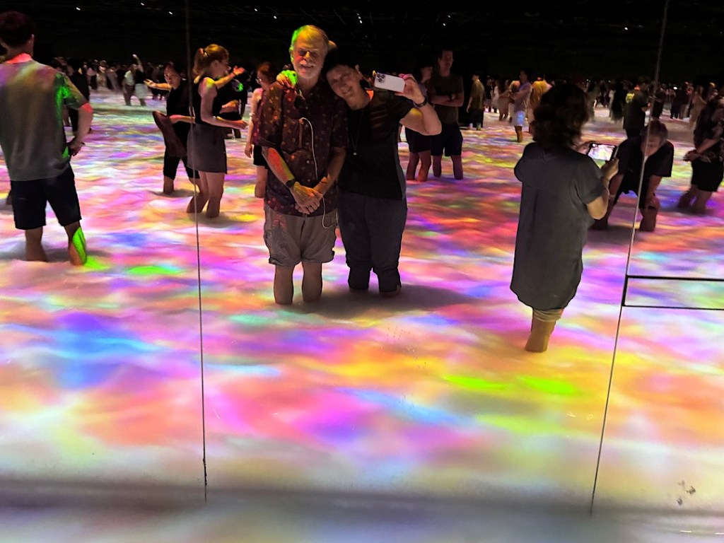 The teamLab art collective doesn’t make ordinary art, however. The collective started more than 20 years ago in Tokyo and has evolved into an eclectic crew of so-called “ultratechnologists” — engineers, artists, animators, architects, and other specialists who create spaces in which participants can lose themselves in fantastic, “borderless” wonderlands. Two are currently open in Tokyo: teamLab Planets (just a short walk from the new fish market) and teamLab Borderless. The latter first opened in 2018 and immediately became the most visited museum in the world (according to the Guinness Book of Records folk.) It then closed and an expanded version opened in February, 2024. Steve and I went to both installations (one Friday morning and the other on Sunday.)