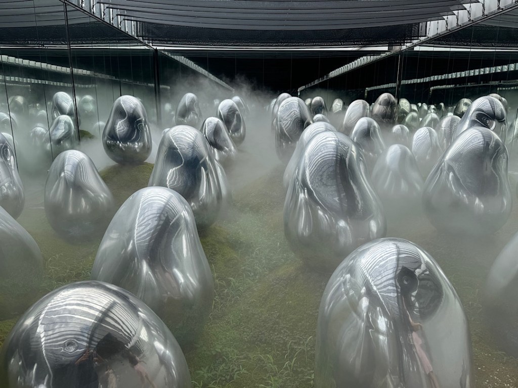 Mirrored walls and ceilings and floors contribute to the sense of infinite wonders.In this gallery, you could lay on the floor and be showered by what felt like all the flowers in the universe.The gigantic balls in this room changed color — in response to the music. And the visitors’ presence?The Planets site includes two beautiful gardens, this one populated by alien shapes nestled in mossy beds.In a second one, we lay among a moving profusion of flowers that appeared to be growing down.
