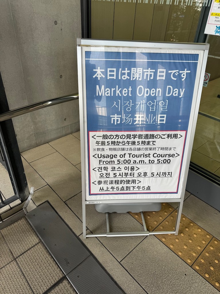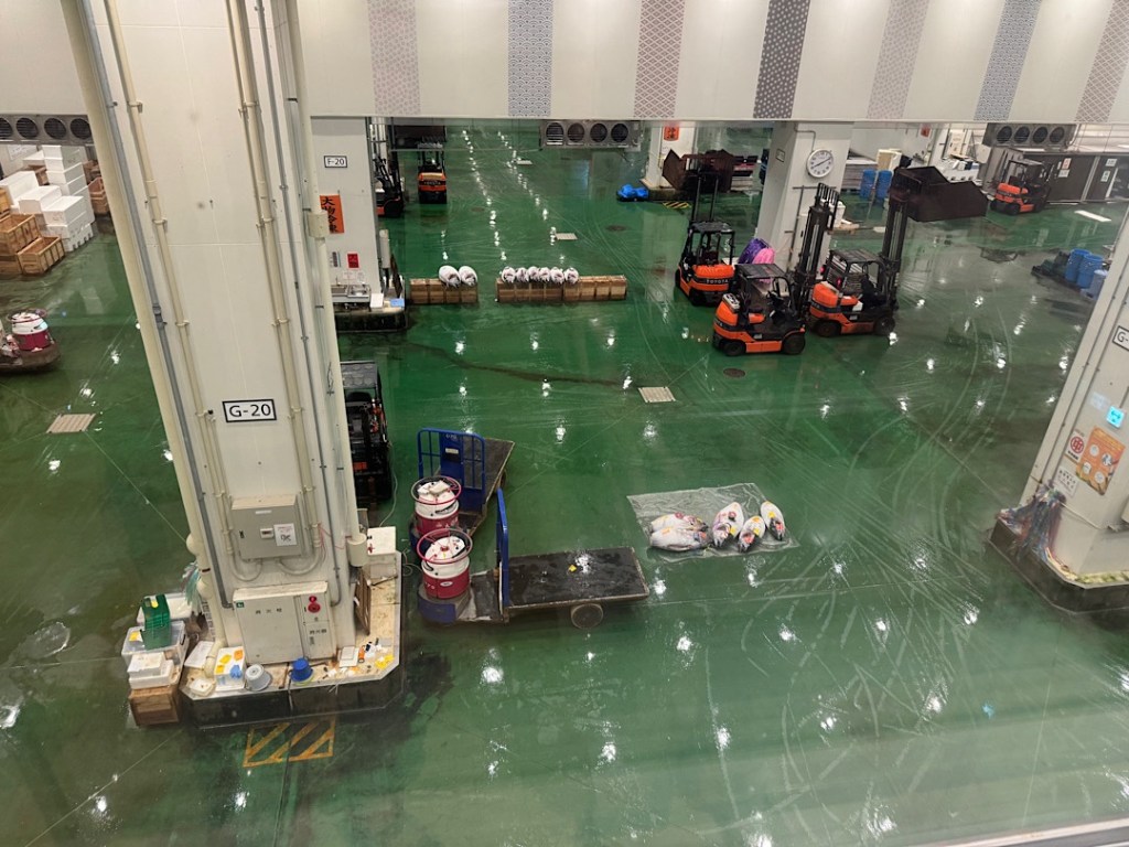 Then the city decided to build something bigger and more modern. The Toyosu fish market replaced Tsukiji in October of 2018, and we were eager to see it. After the long plane rides followed by our monorail and subway journey Thursday night, we didn’t feel like dragging ourselves out of bed at 5 am Friday morning. We only got out the door about 7 am, and it was 8 by the time we reached our destination. That was well after most of the commercial action had concluded, but even if we’d arrived two hours earlier, I’m sure I would have been disappointed.