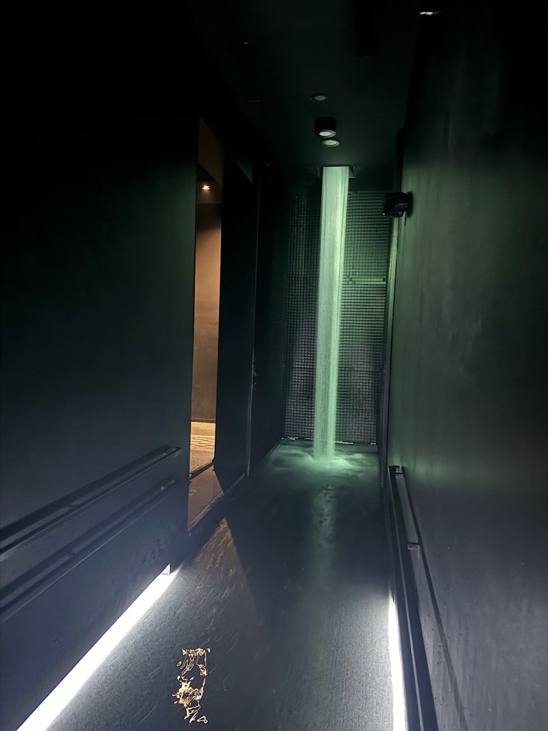 We loved them both but Planets was our favorite. We had to take off our shoes and stow them in lockers, not because this is Japan but because visitors enter by ascending a long, dark ramp down which water streams.