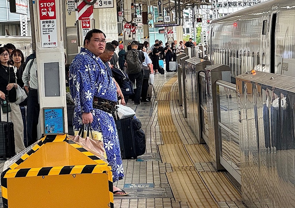 We had to leave Tokyo this morning (Tuesday, September 24). From Tokyo Station we boarded a bullet train bound for Kobe — the start of the part of this trip when we’ll be visiting places we’ve never seen before. Also leaving town on the same train was one of the sumo wrestlers. Somehow that felt lucky.