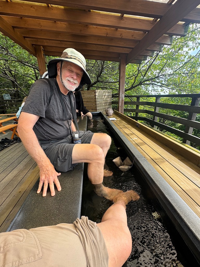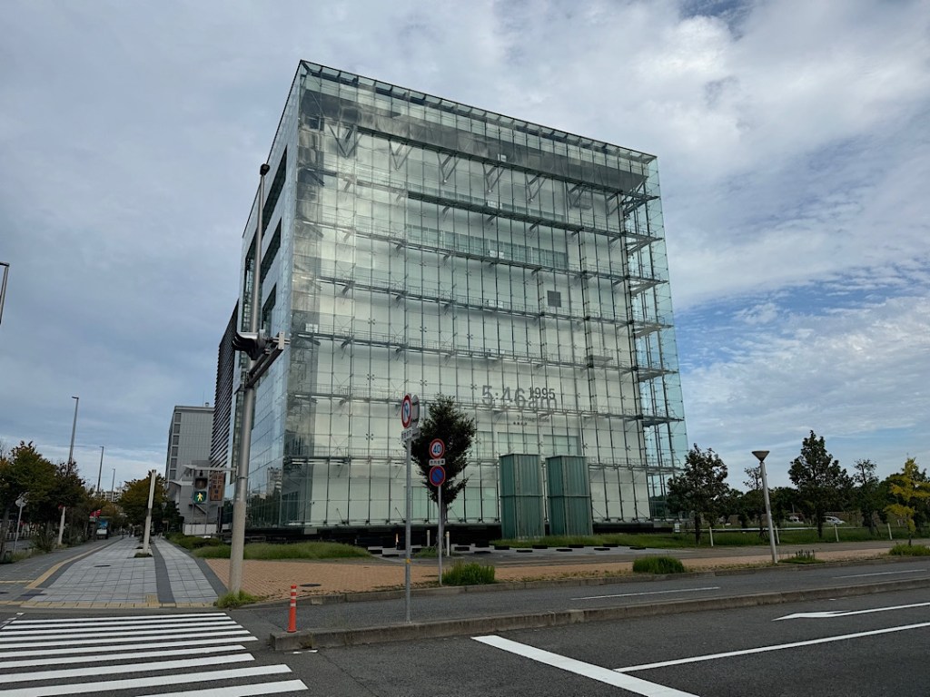 Views of the city and distant sea line were dazzling — as were those of our hotel (the nearest skyscraper to the cable car line.)The garden offered many beautiful plantings, along with some unusual features.We were able to stop for an herbal foot-soaking.And we found some delightful ways to relax. Then we hiked down the mountain, stopping at a 100-year-old tea house for lunch at seats where we could look at the Nunobiki Falls, ranked among the most impressive in Japan. They certainly impressed us.Wednesday afternoon we found our way to this building: the Great Hanshin-Awaji Earthquake Memorial and Disaster Reduction and Human Renovation Institution.