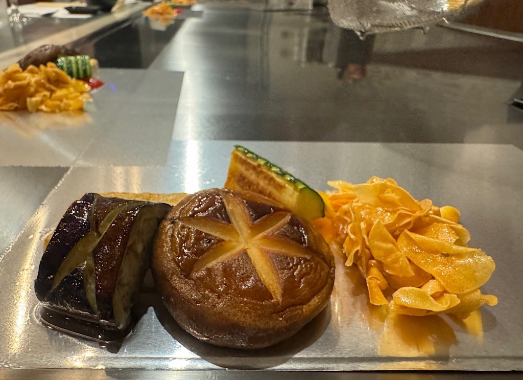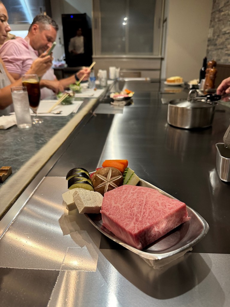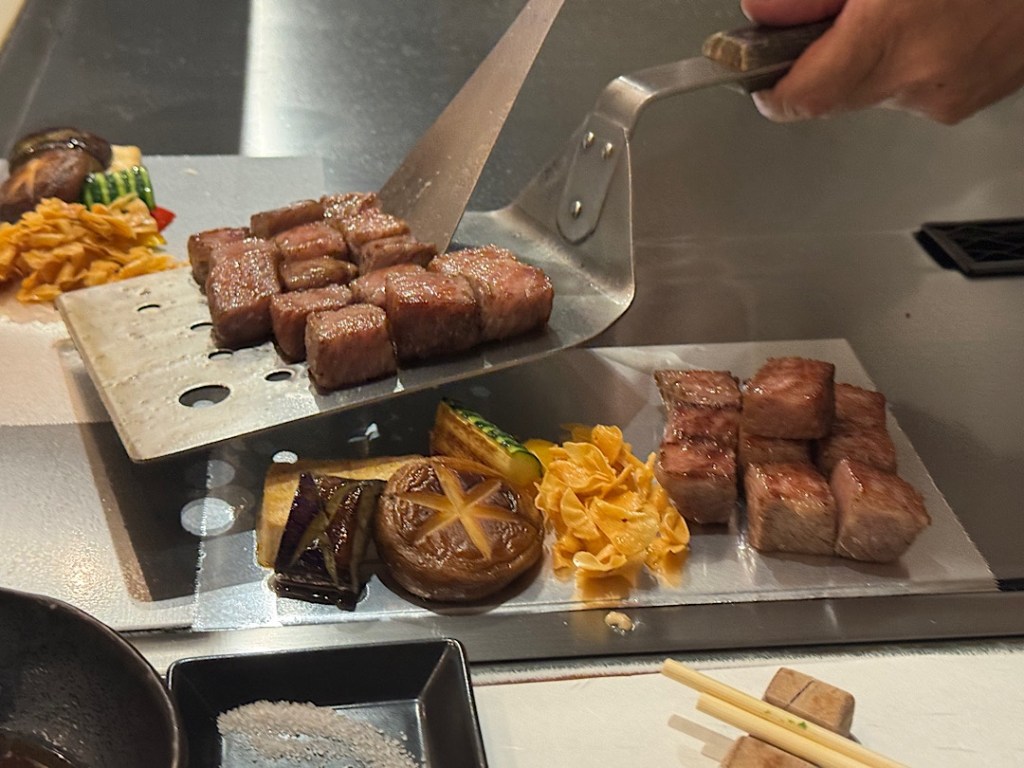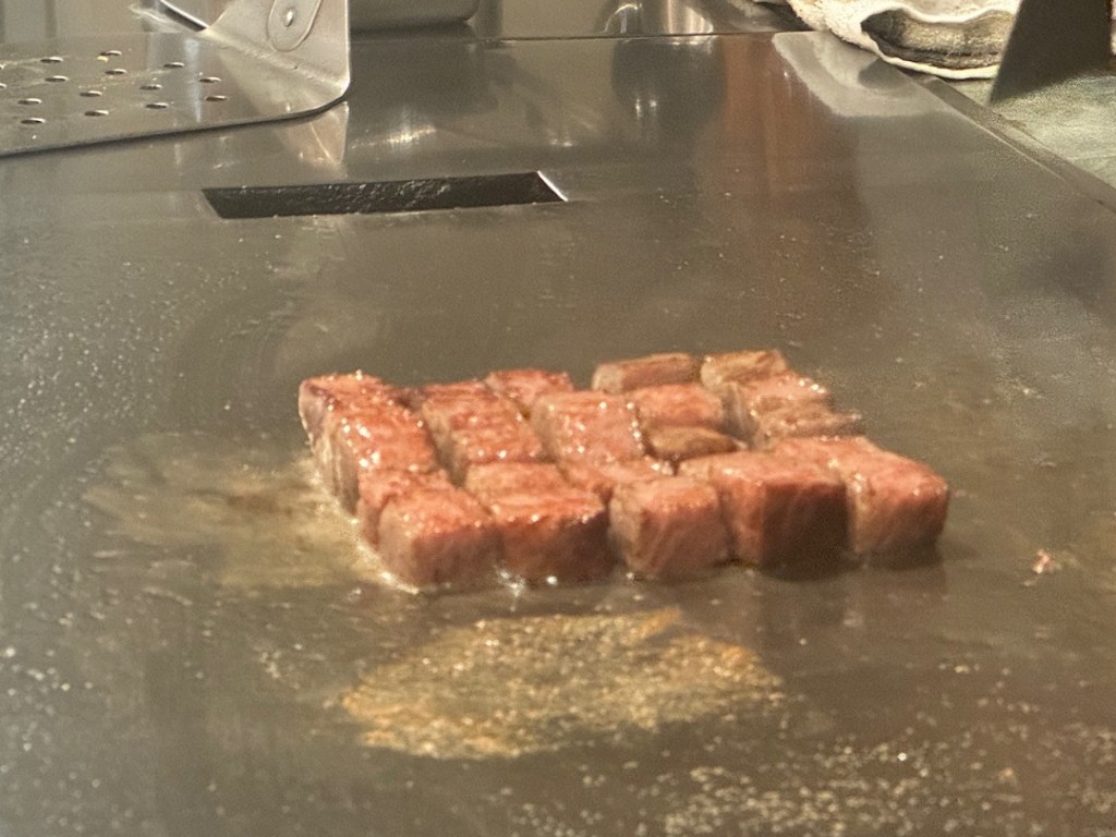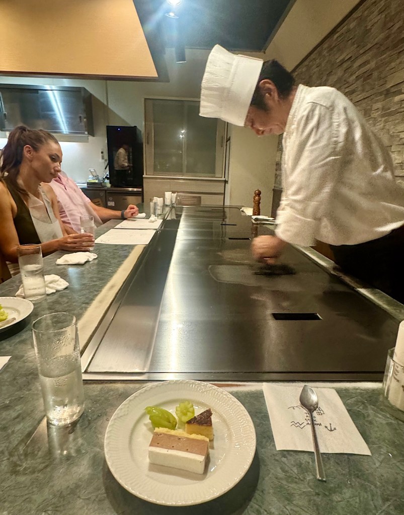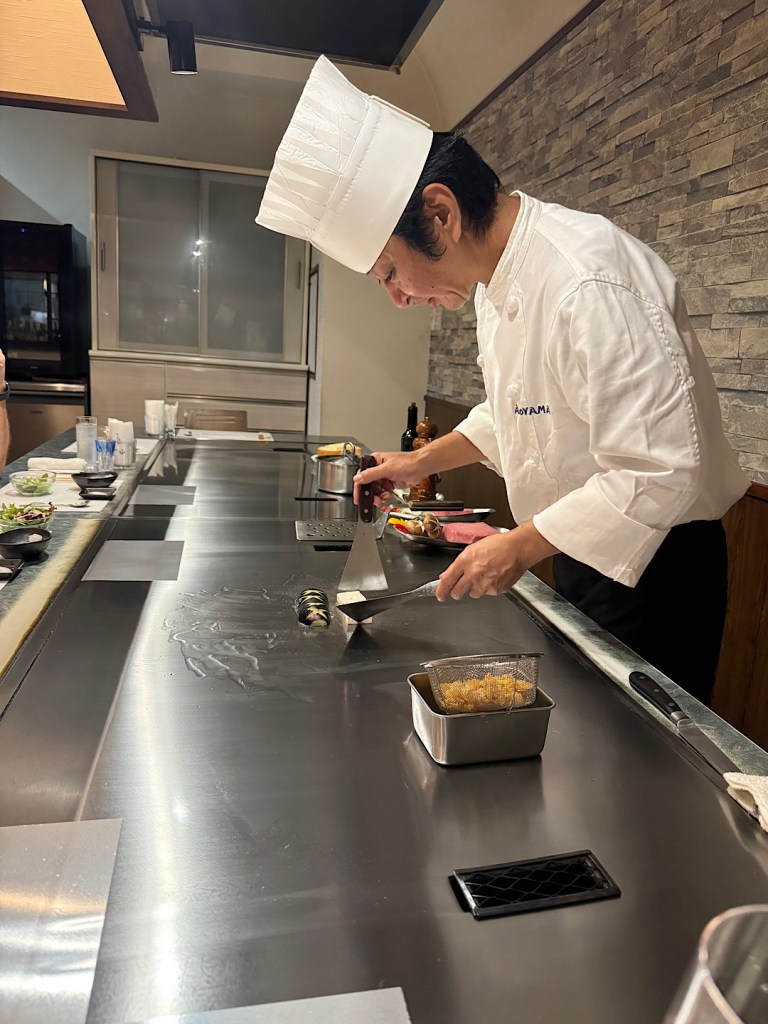 A wiry guy in a white jacket and chef’s toque took his place behind the pristine cooking station. He introduced himself as Shuhai, grandson of the woman who founded Aoyama 61 years ago. Two facts immediately became clear: 1) he was a master with knives and heat and 2) also quite the entertainer. As he cooked — first a round of vegetables, then a 9-ounce chunk of sirloin for Steve and me, he bantered with the four of us nonstop.
