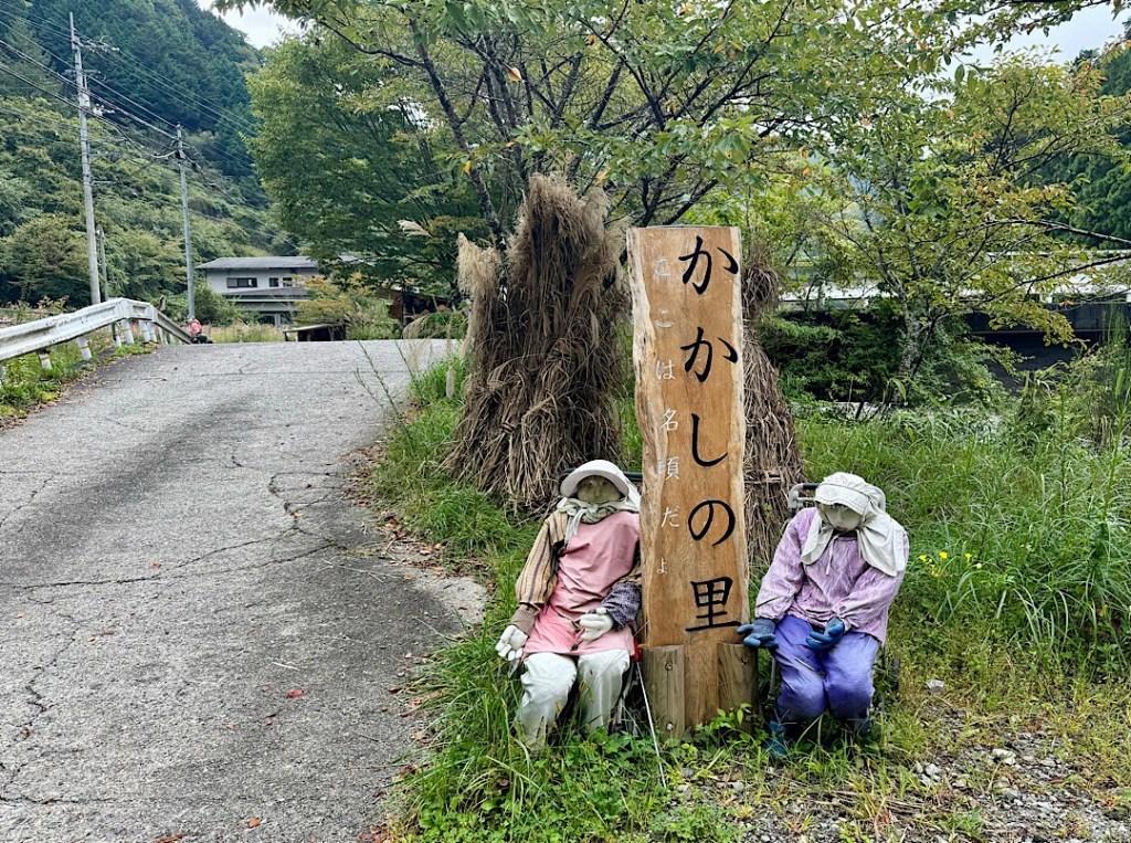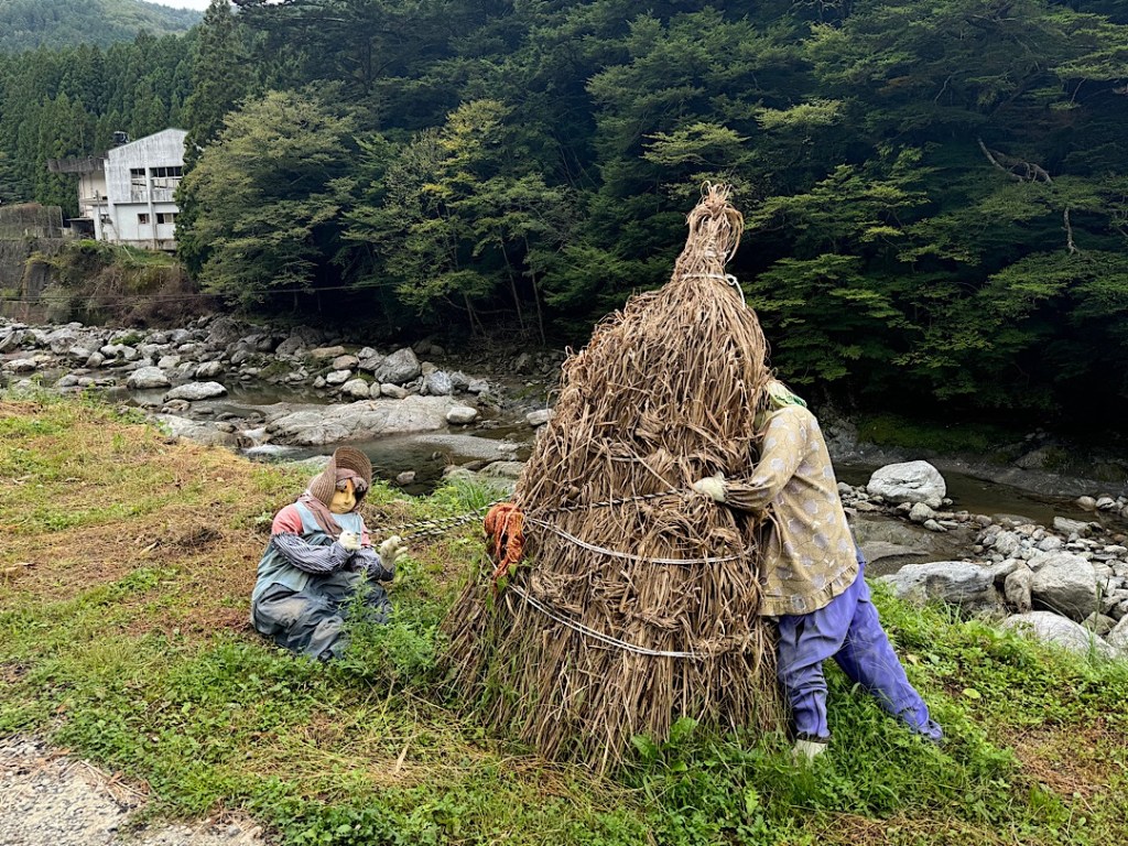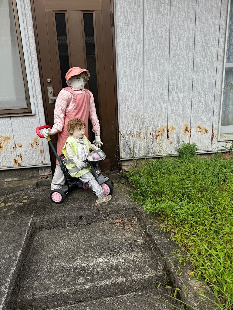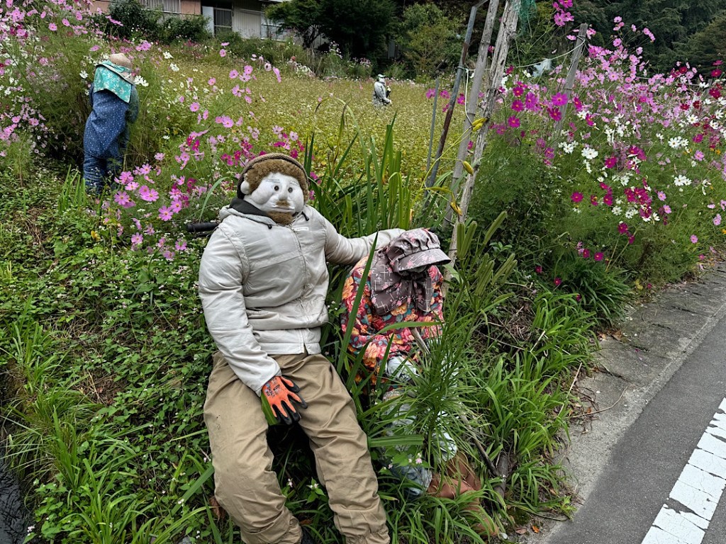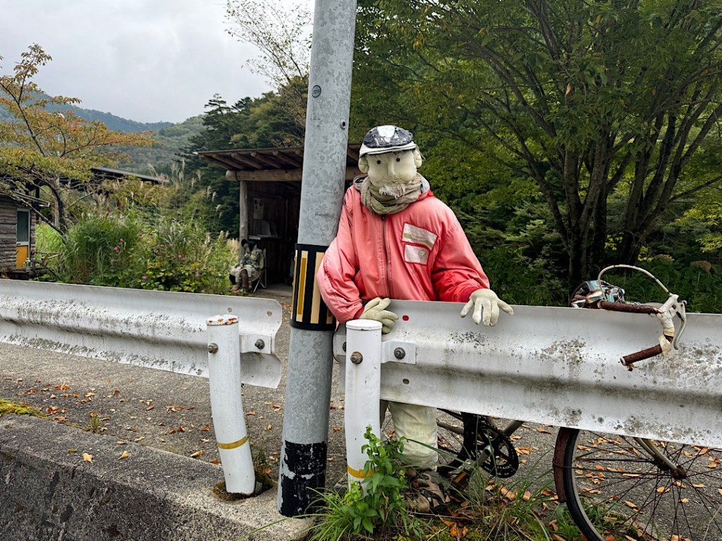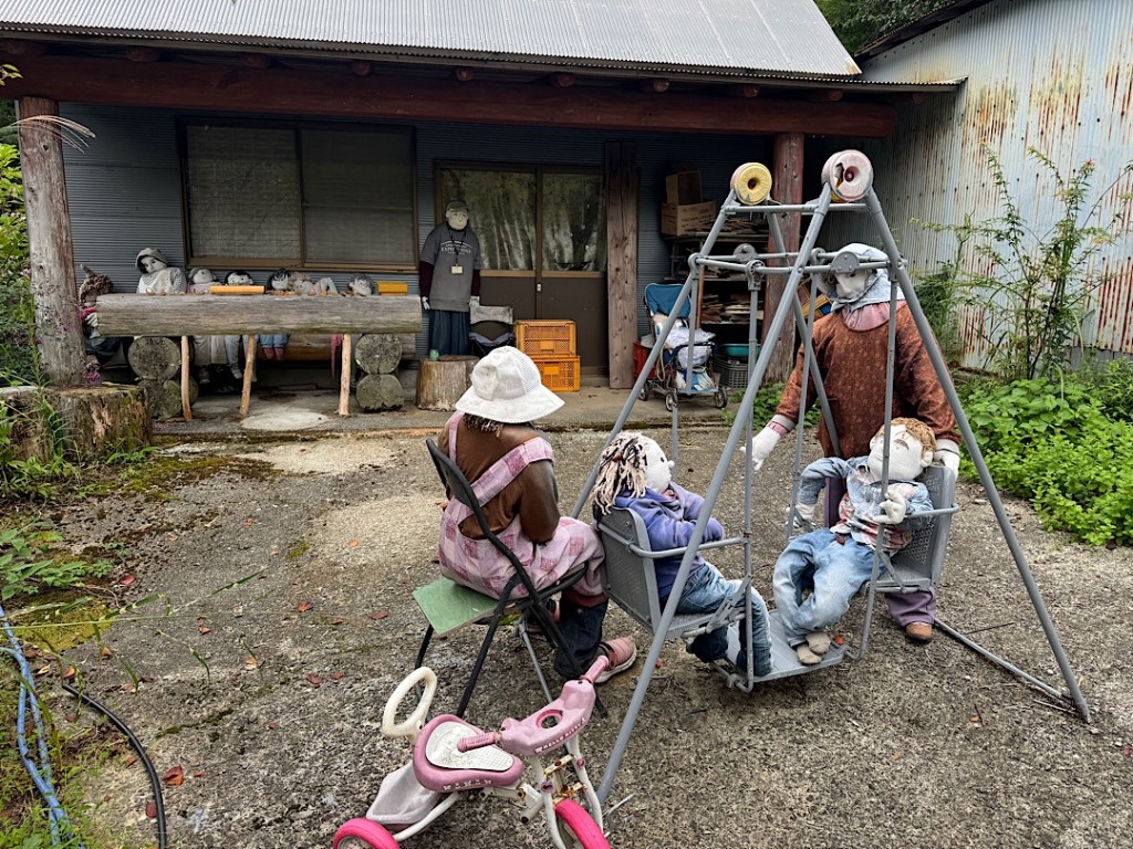 The village of Nagoba, about 45 minutes from Miyoshi, experienced this in dramatic fashion after authorities automated the local dam that had been the town’s biggest employer. From a couple of hundred people, Nagoba’s population plummeted to a few dozen. In 2003 an artist from the village named Tsukiji Ayano returned from living and working in Osaka. Shocked by the change in her home town, she started creating replacement people made of cloth stuffed with newspapers. Since she began, Ayano has made hundreds of the scarecrows (kakashi). She’s brought the village back to life in a manner that’s both charming and eerie, as Steve and I learned when we visited it this morning.