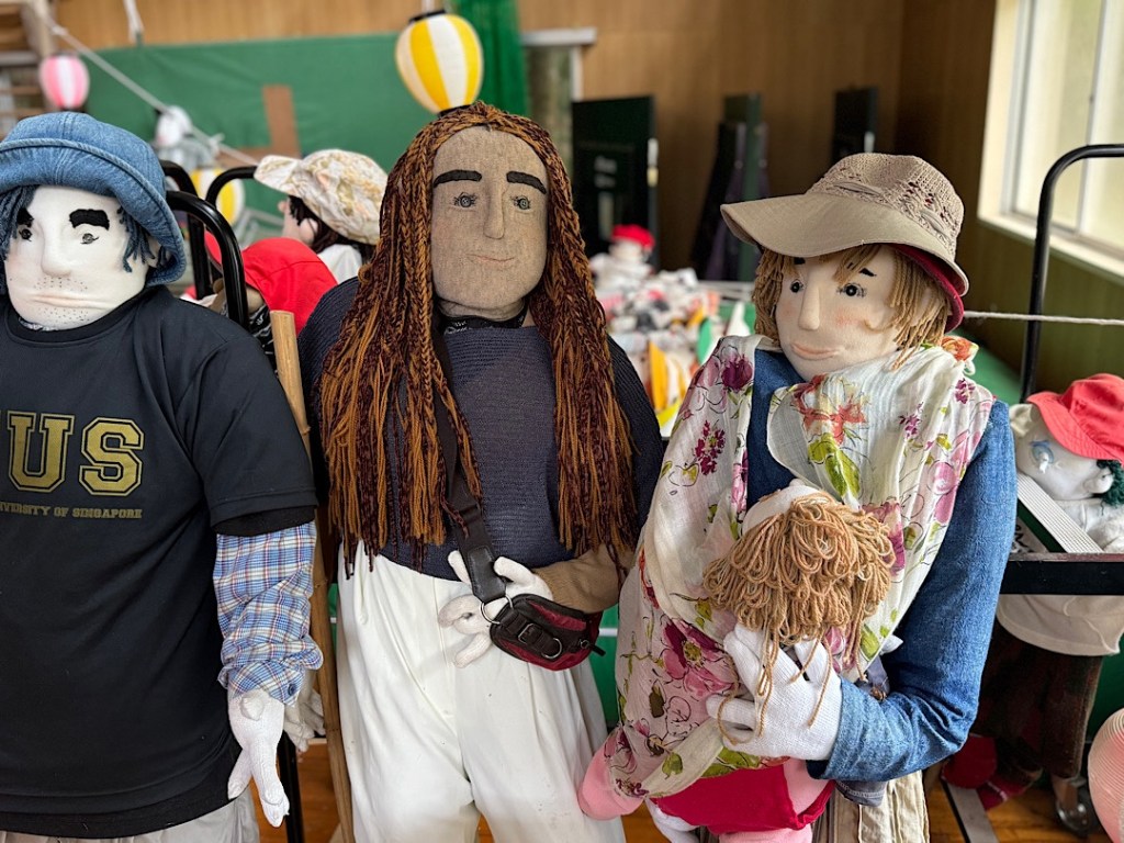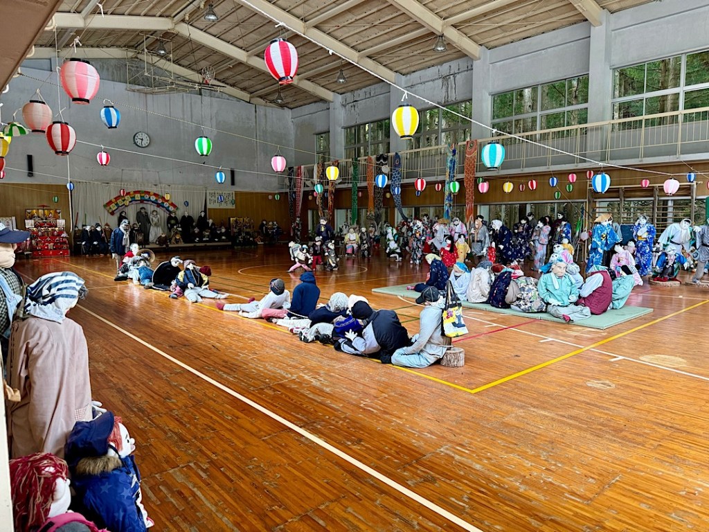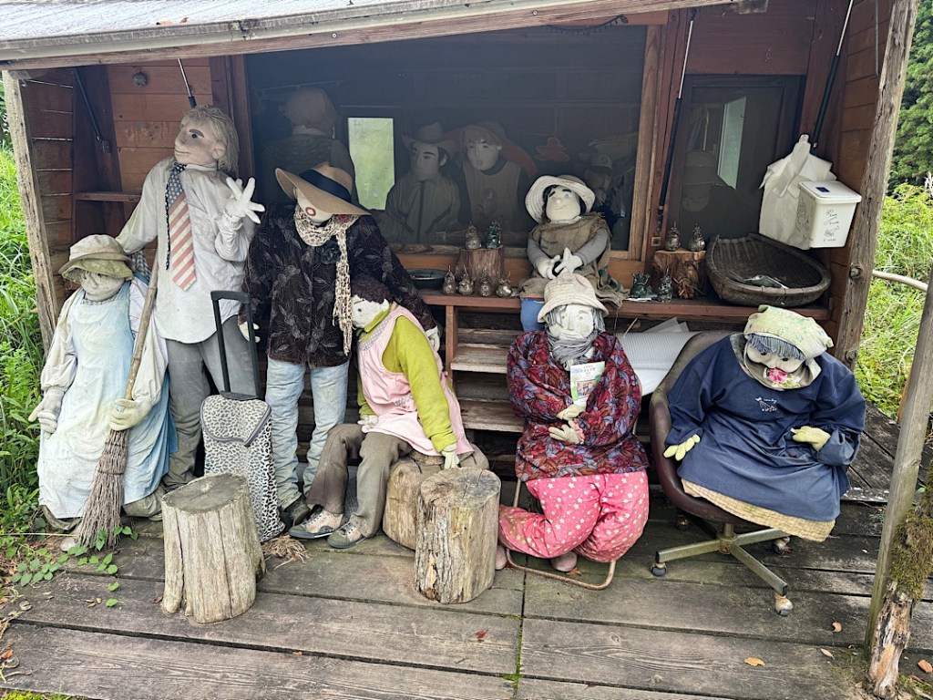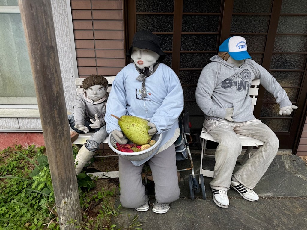 Scarecrow people work at village tasks.A mother and child, long absent in the flesh.I think these folks are waiting at a bus stop. No signs explain what you’re seeing. That would shatter the illusion.We arrived a little after 10 in the morning. For a while, we encountered nobody but the scarecrow people.Scarecrow people sat at the side of the road. Scarecrow people toiled in the front yards.We read online that Ayano has tried to reincarnate everyone who lived in the village of her childhood.Certainly the scarecrow people feel like individuals.I was amazed to note that most of the figures have eyes made from buttons. They feel so lifelike.Some eyes are created differently.The scarecrow people fish…They surprised me, like this guy, hanging out in a tree.Ayano has filled the former kindergarten and elementary school with scarecrow children and their families. She’s packed the school gym with personalities.Grandparents present for a performance?Parents of a future student?