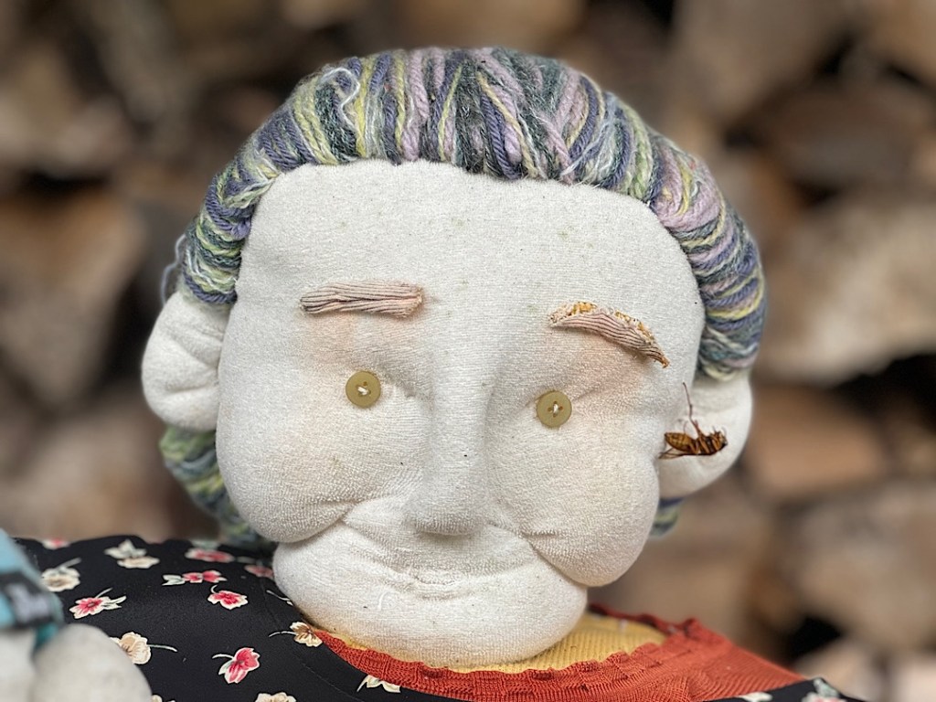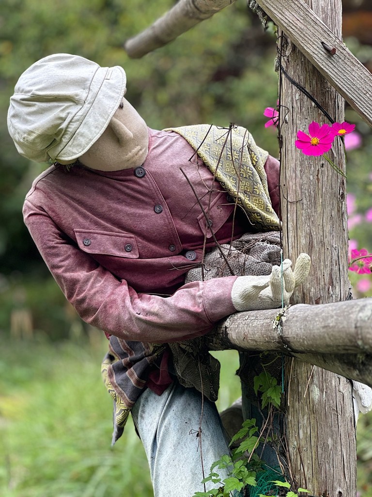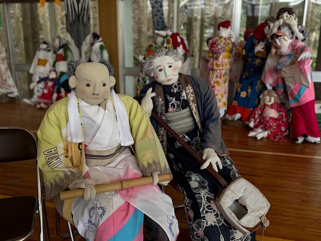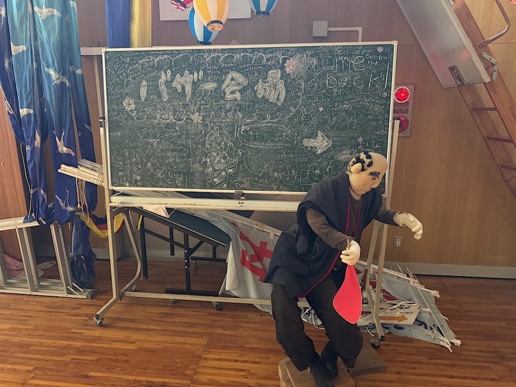 Scarecrow people work at village tasks.A mother and child, long absent in the flesh.I think these folks are waiting at a bus stop. No signs explain what you’re seeing. That would shatter the illusion.We arrived a little after 10 in the morning. For a while, we encountered nobody but the scarecrow people.Scarecrow people sat at the side of the road. Scarecrow people toiled in the front yards.We read online that Ayano has tried to reincarnate everyone who lived in the village of her childhood.Certainly the scarecrow people feel like individuals.I was amazed to note that most of the figures have eyes made from buttons. They feel so lifelike.Some eyes are created differently.The scarecrow people fish…They surprised me, like this guy, hanging out in a tree.Ayano has filled the former kindergarten and elementary school with scarecrow children and their families. She’s packed the school gym with personalities.Grandparents present for a performance?Parents of a future student?