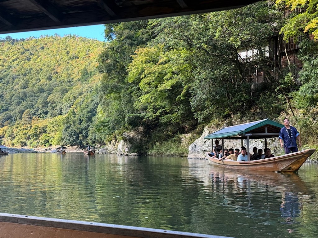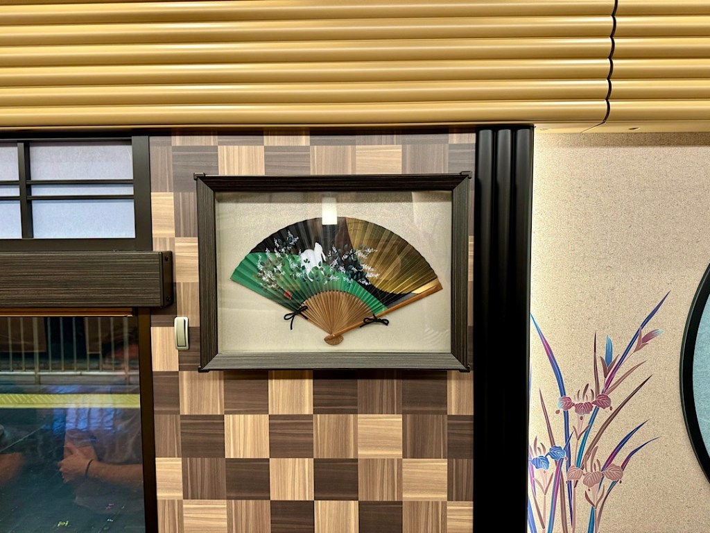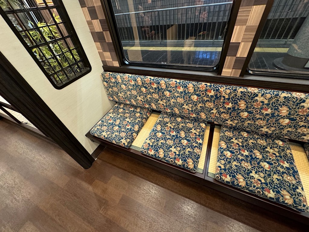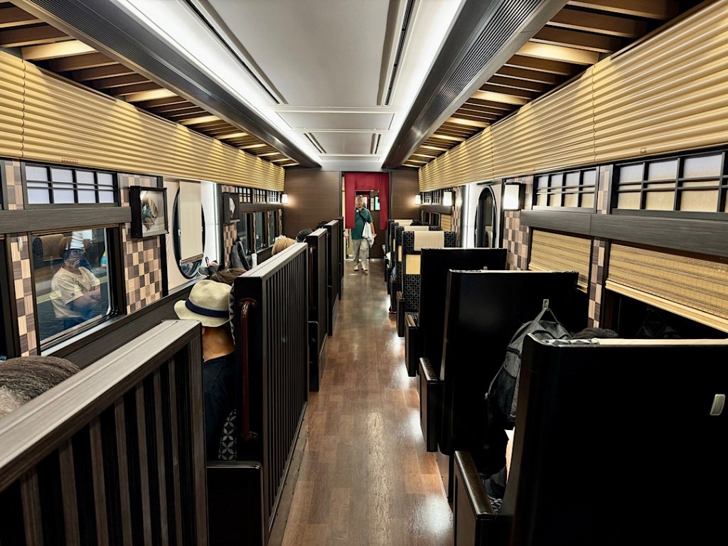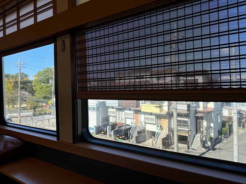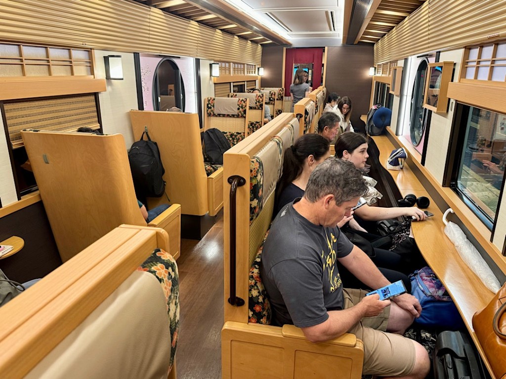 I can’t say that about the actual train that carried us from Kyoto to Osaka last Sunday. It wasn’t a bullet train. I don’t even remember how I learned about it. (Maybe a one-line mention in some guide book I consulted?) The Kyo-train GARAKU, as it’s called, only operates on weekends and holidays. The one we caught (the first of four making the round-trip that day) wasn’t mobbed with tourists. Many of our fellow passengers were Japanese. We didn’t have to buy any special ticket. We just used our marvelous “IC” cards (which worked on every bus, train, and metro line we took throughout the country, except for the Shinkansens.)