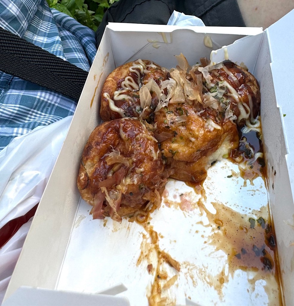 Everywhere we looked, we saw people lined up in the street; we despaired of getting a taste of any of it. But on a quiet byway we finally scored some marvelous takoyaki.
