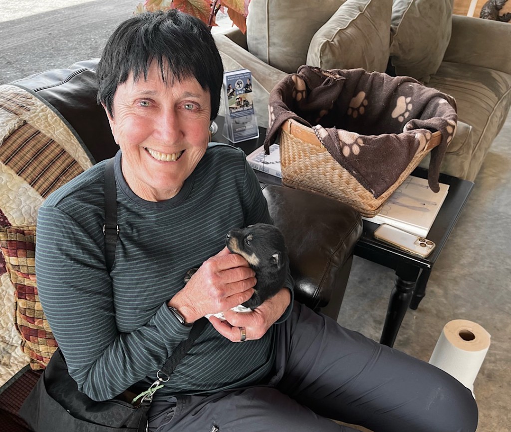 The grand finale, back in the entry hall, came when Sue brought out a basket of two-week-old puppies. We took turns cuddling them.