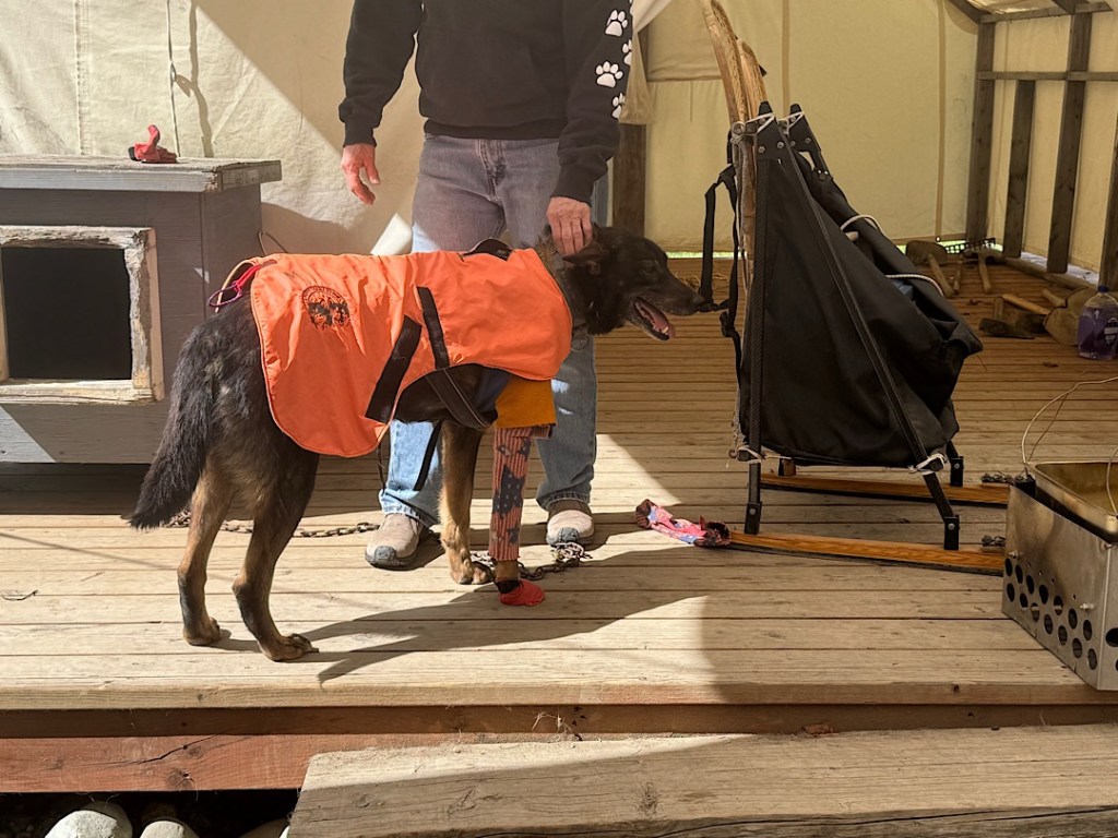 Sue led us to an amphitheater where she used a dark female named Arabica to demonstrate the gear that Iditarod competitors commonly wear.