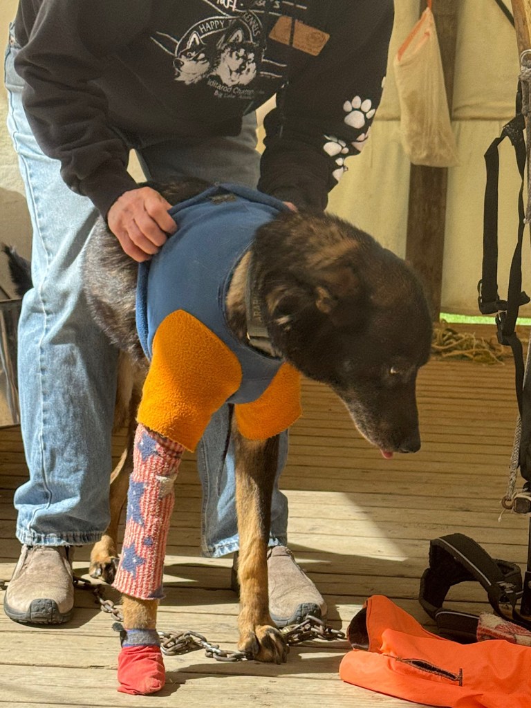 ArabicaBooties to protect their feetLeggings and a shirt and coat to protect against the cold.Racing with teams of 12-16 dogs, the Iditarod competitors spend a great deal of time dressing and undressing their dogs.
