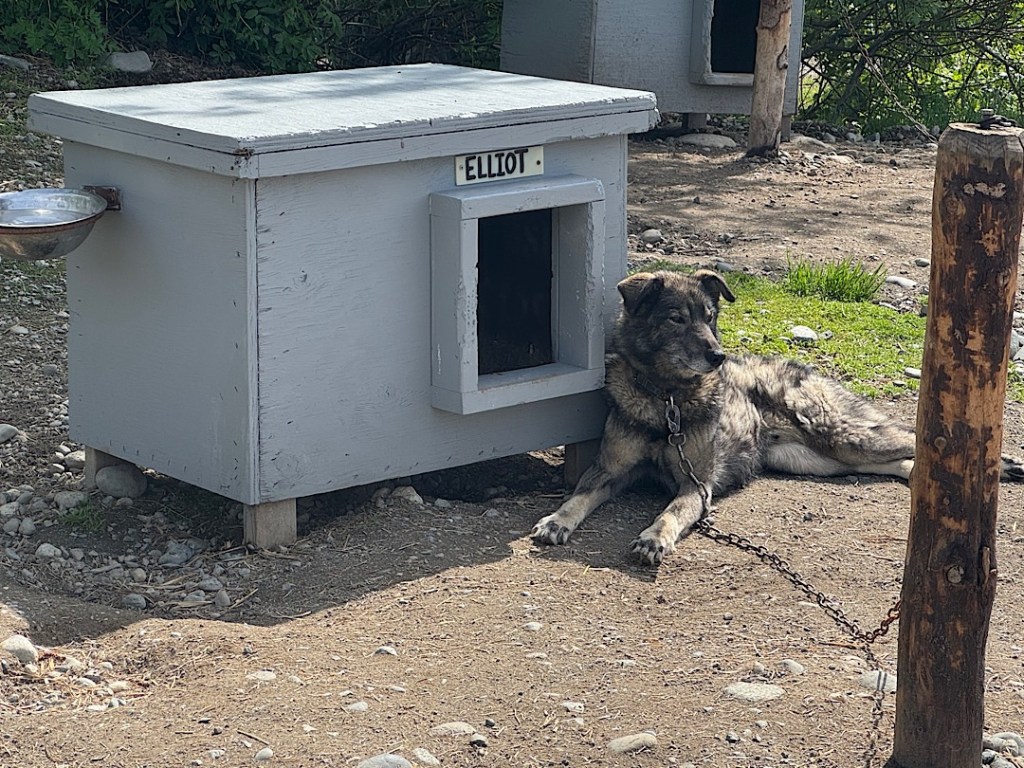 Spending some time at the Happy Trails kennels with these sled dogs and their humans was so much fun, I could have joined in the chorus. It was not a pleasure we’d anticipated. Steve and I had missed an opportunity to visit the sled dog kennels at Denali (the only national park in the United. States to maintain a dog team.) But we did watch a short film in the visitor’s center about them, and it inspired me to go online first thing Tuesday morning to see if we could visit a kennel in greater Anchorage. I saw that the Happy Trails staff would be giving a tour that afternoon, and we could still get tickets.