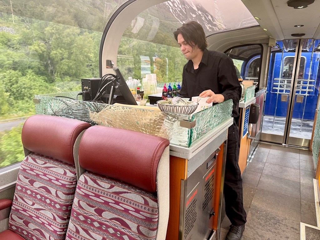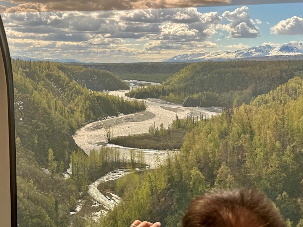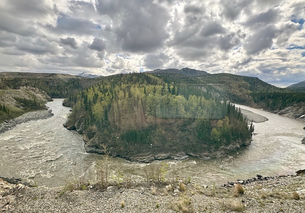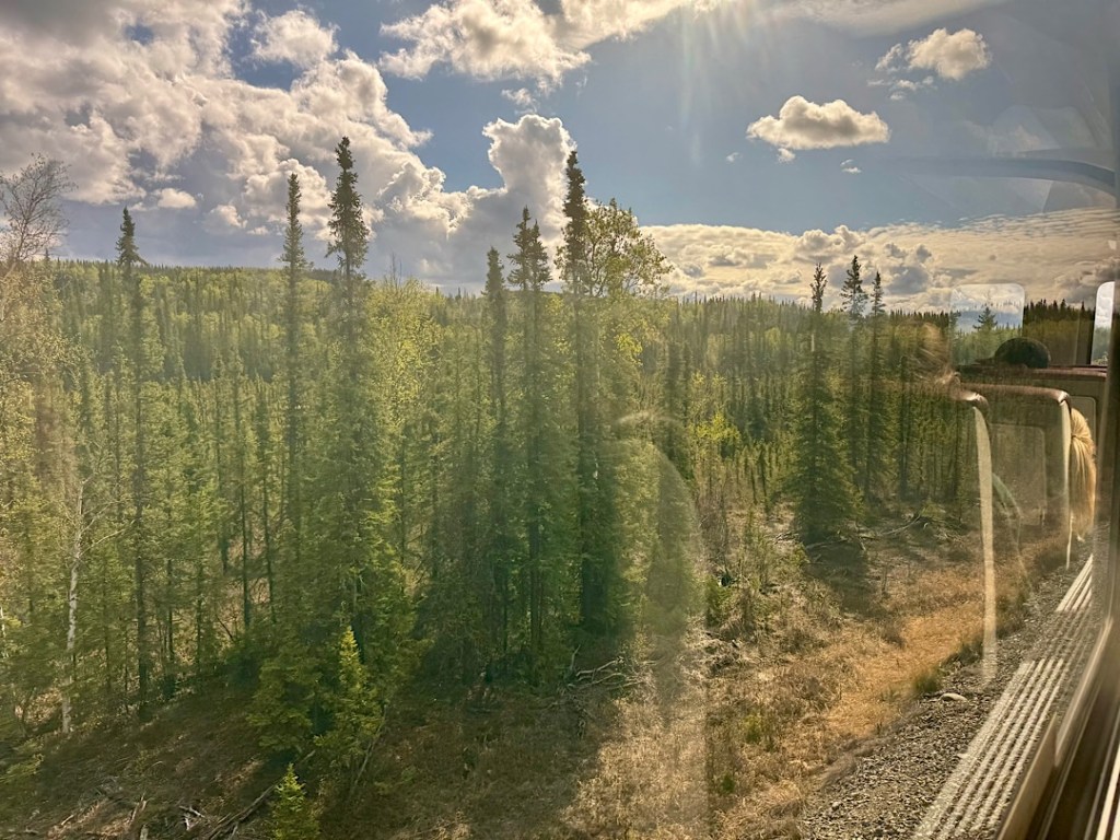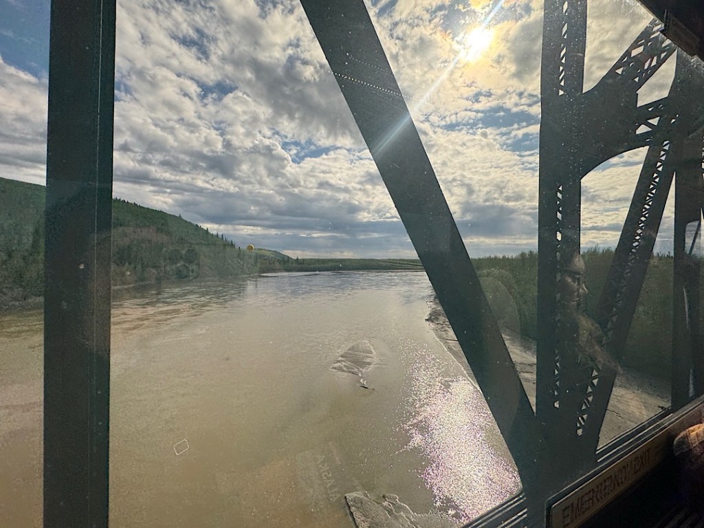 We soon learned that Amtrak does NOT run it; the Alaska state government does. Built 100 years ago to serve early gold miners, it’s now popular with travelers. Planning this trip, I wanted to ride almost all of it, from Fairbanks to Denali, then continuing on to Anchorage, stopping there, then taking the line that runs down to Seward (on the southern coast of the main Alaskan peninsula) and back. Because the scenery promised to be so beautiful, I splurged and got us “Gold Star” seats in double-decker cars with wrap-around views through the glass dome and meals (included) in the dining room below.